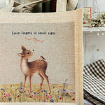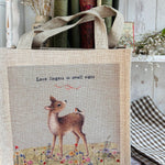 Measuring 25cm by 25cm with a 10cm gusset, this adorable little bag is made from burlap style fabric. It features the sweetest deer and robin design and would be perfect for taking snacks/lunch to work or carrying a few stationery essentials.