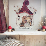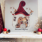 This tempered glass chopping board measures approximately 20cm square. It features a sweet bunny and toadstool house design and would be a lovely addition to your kitchen or dining table this autumn and beyond !