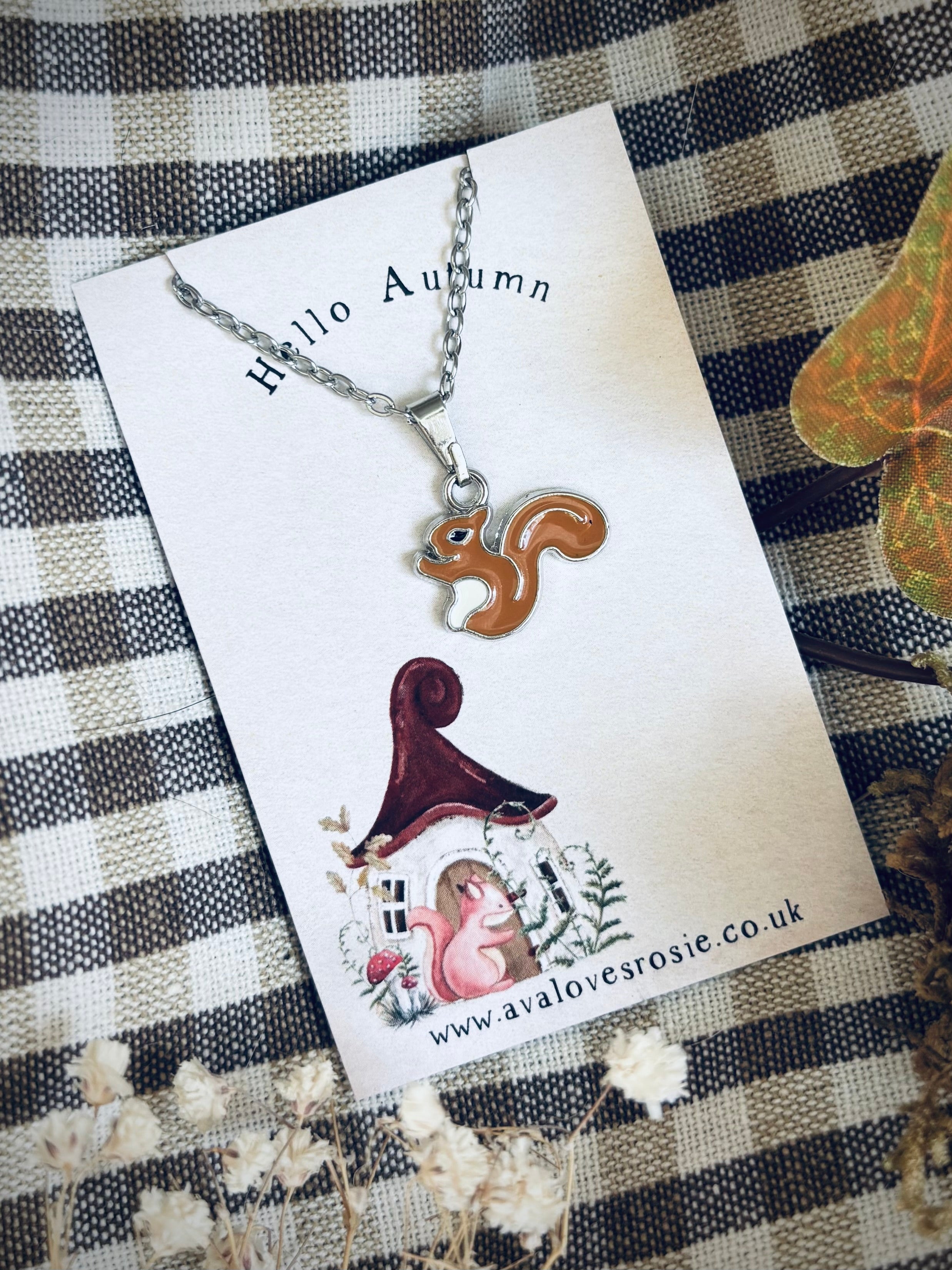 Silver tone stainless steel chain with enamel squirrel pendant - we have tan, brown and grey squirrels and you will receive one of these colours at random.