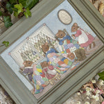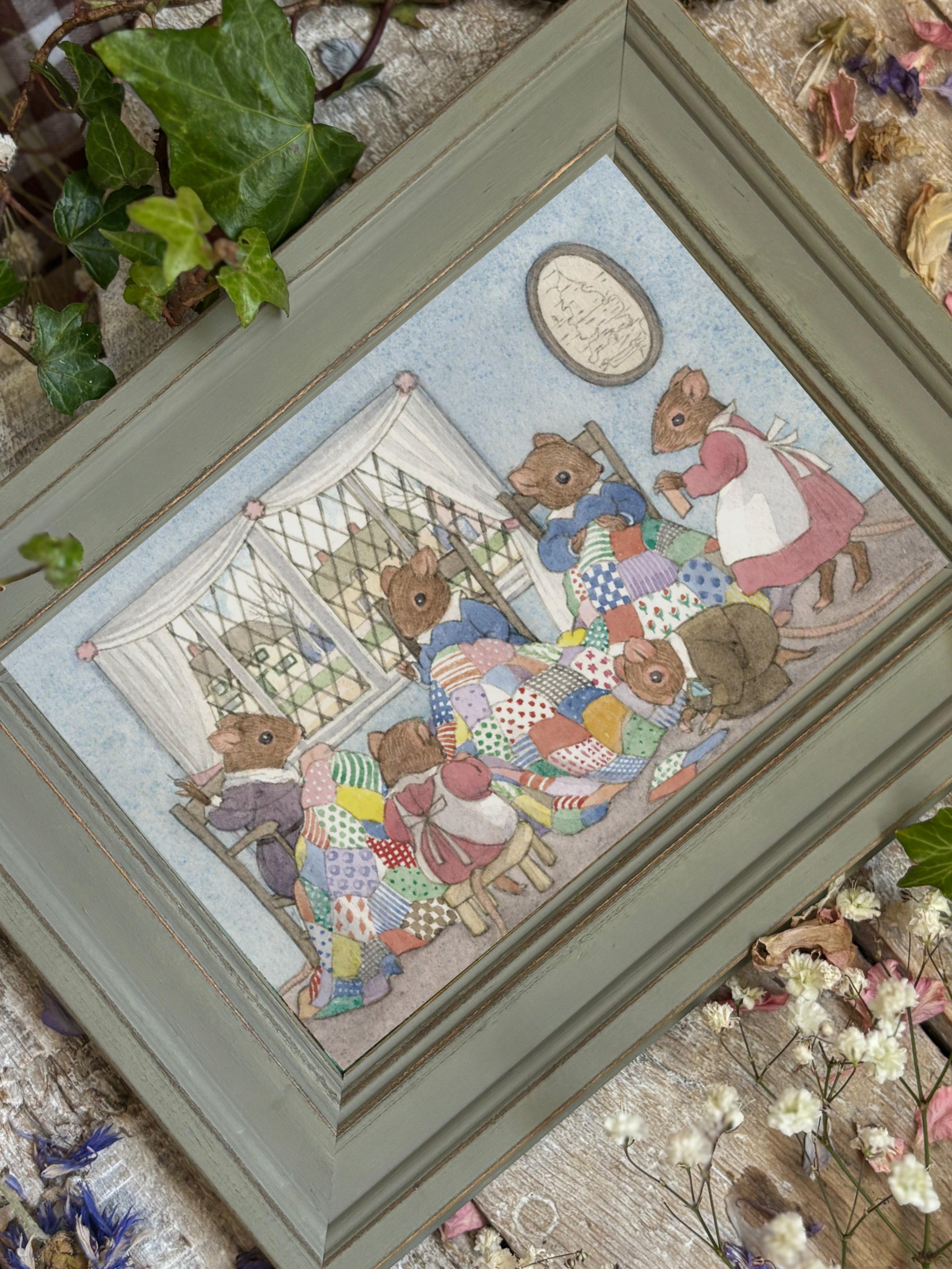 This beautiful The Patchwork Quilt Margaret Tempest postcard by The Medici Society has been framed in a sweet, rustic style sage coloured frame.