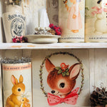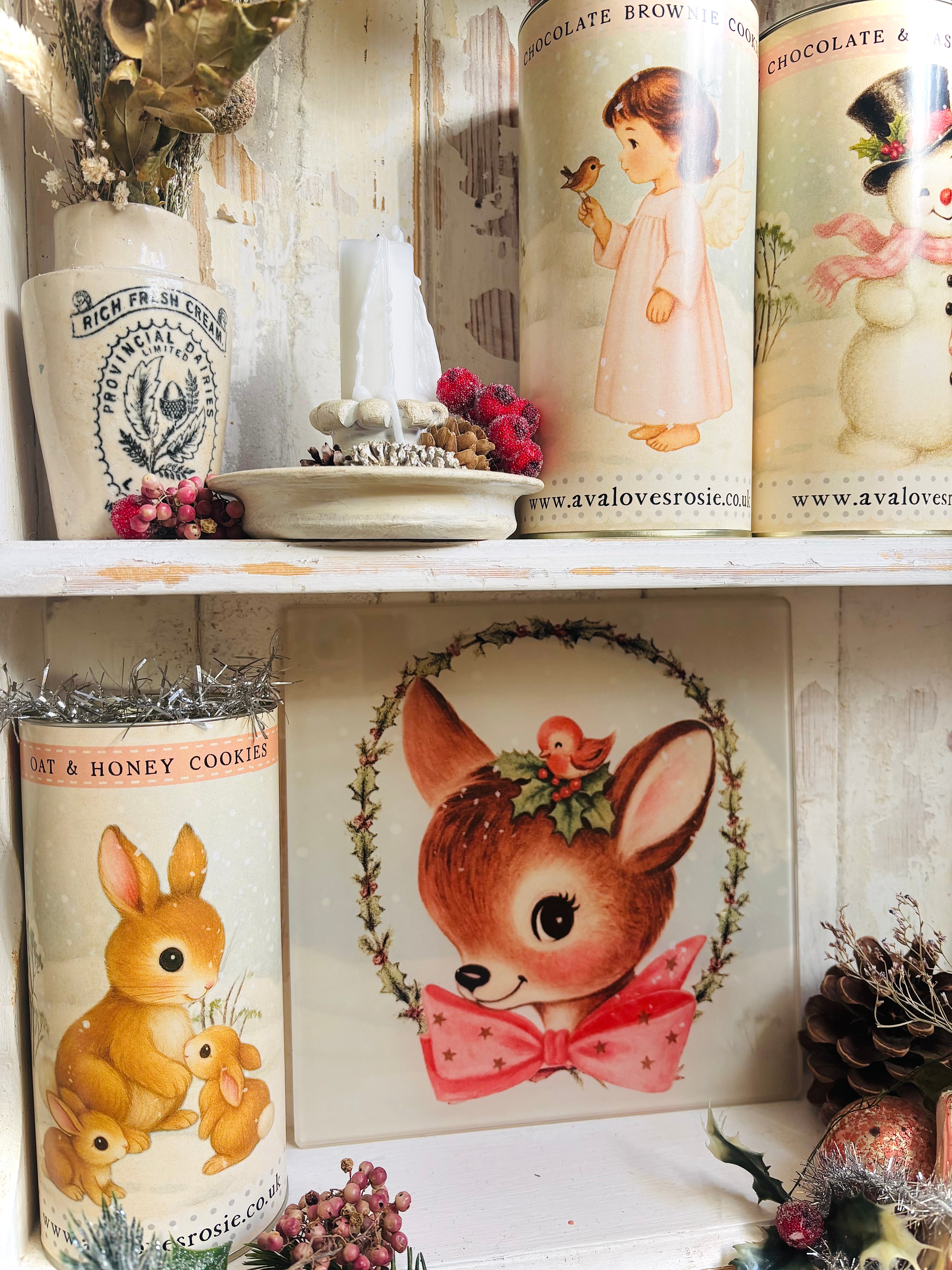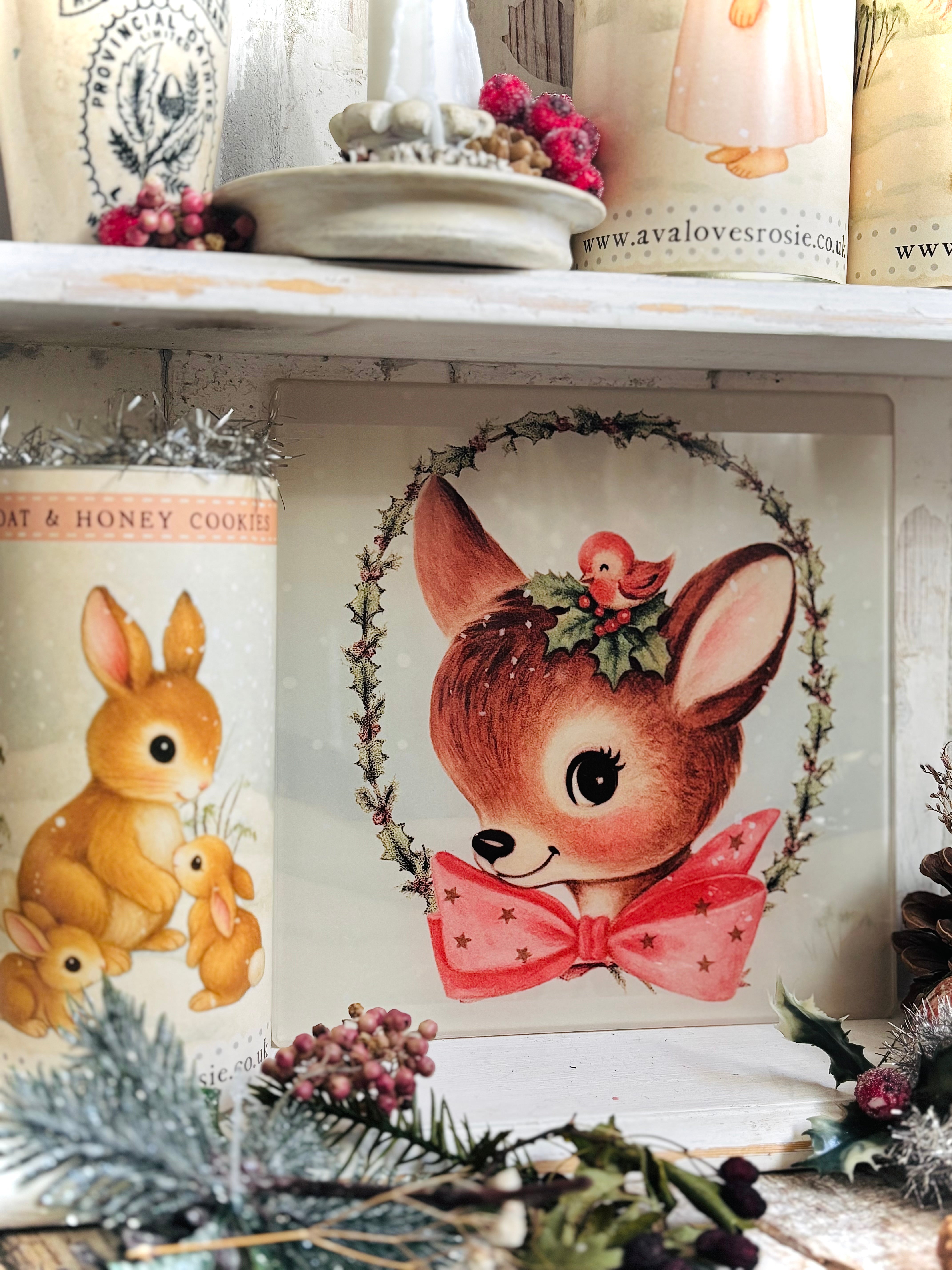 This tempered glass chopping board measures approximately 20cm square. It features a sweet vintage inspired design and would be a super cute addition to your Christmas kitchen or dining table!