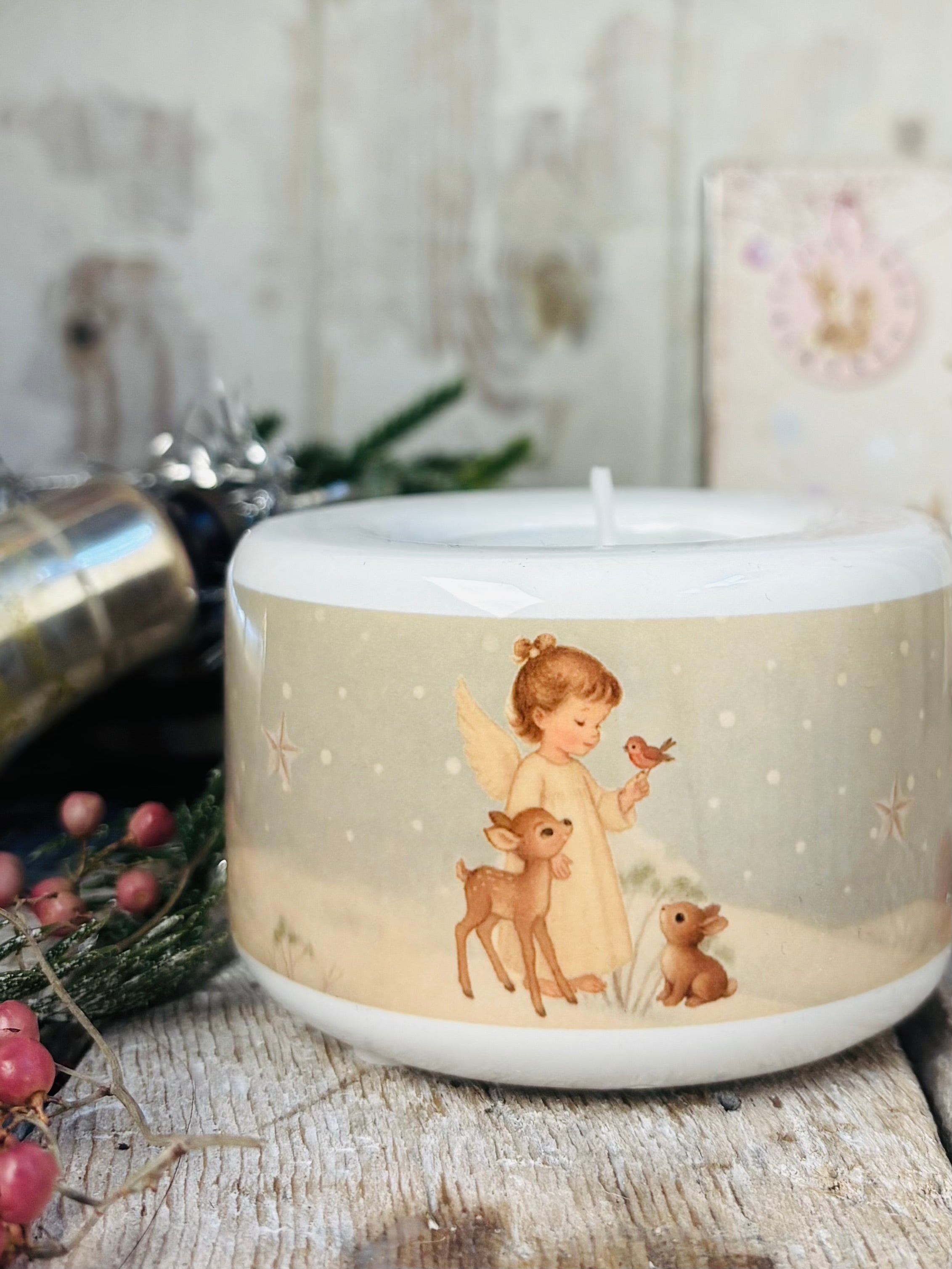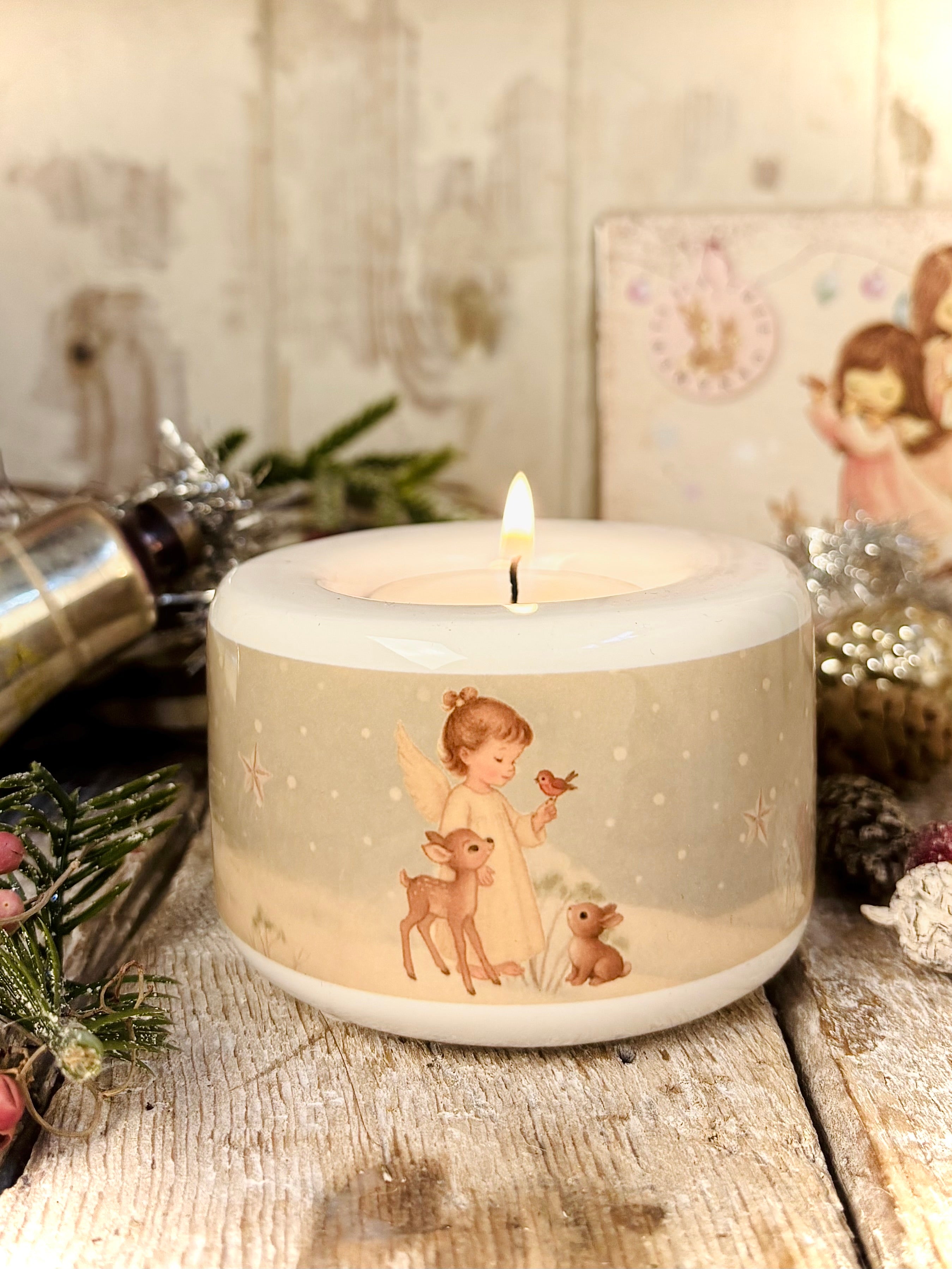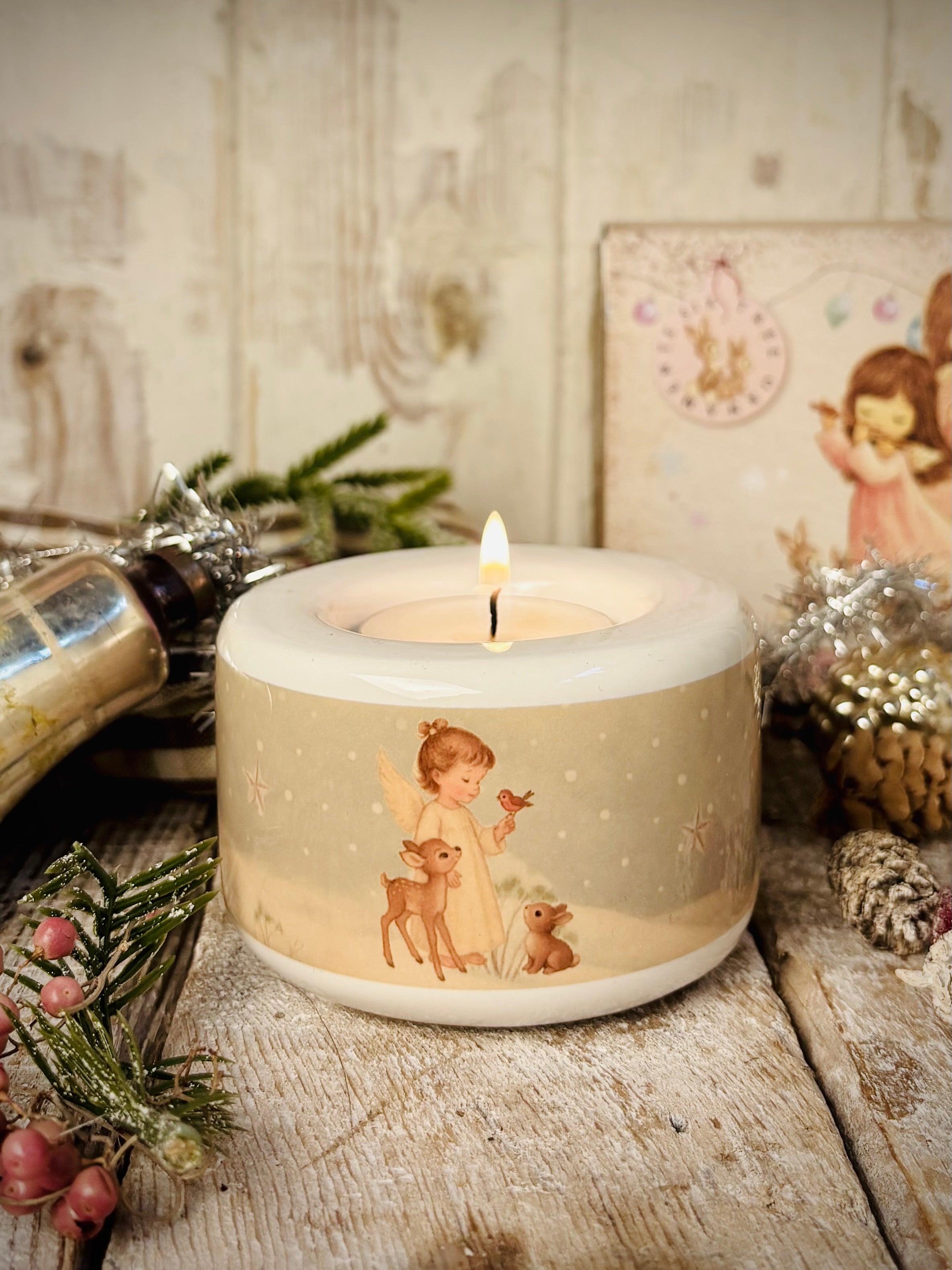 This sweet ceramic tea light holder features a little angel with deer and bunny.