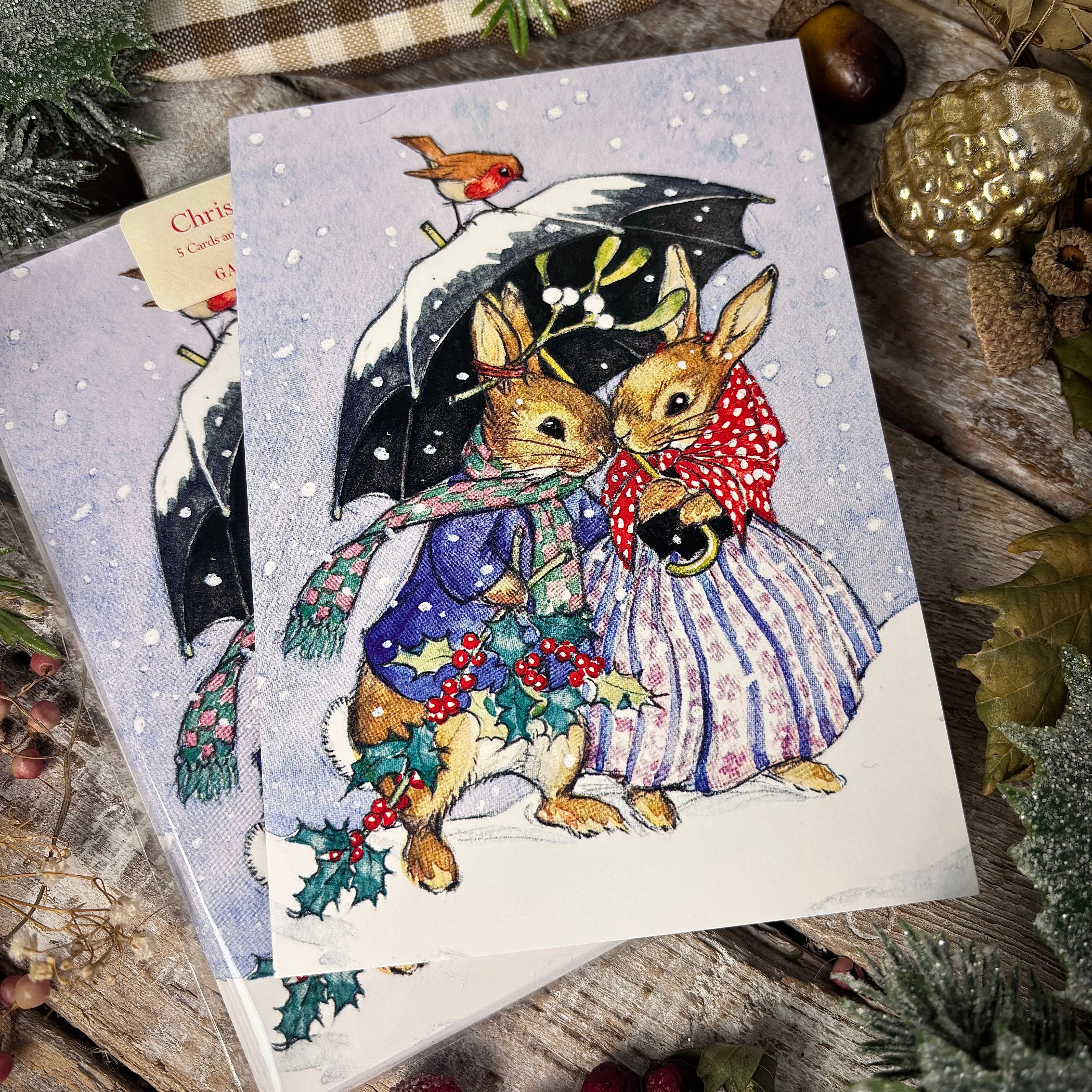 Pack Of Five Christmas Cards - Molly Brett - Two Bunnies Under Umbrella G399