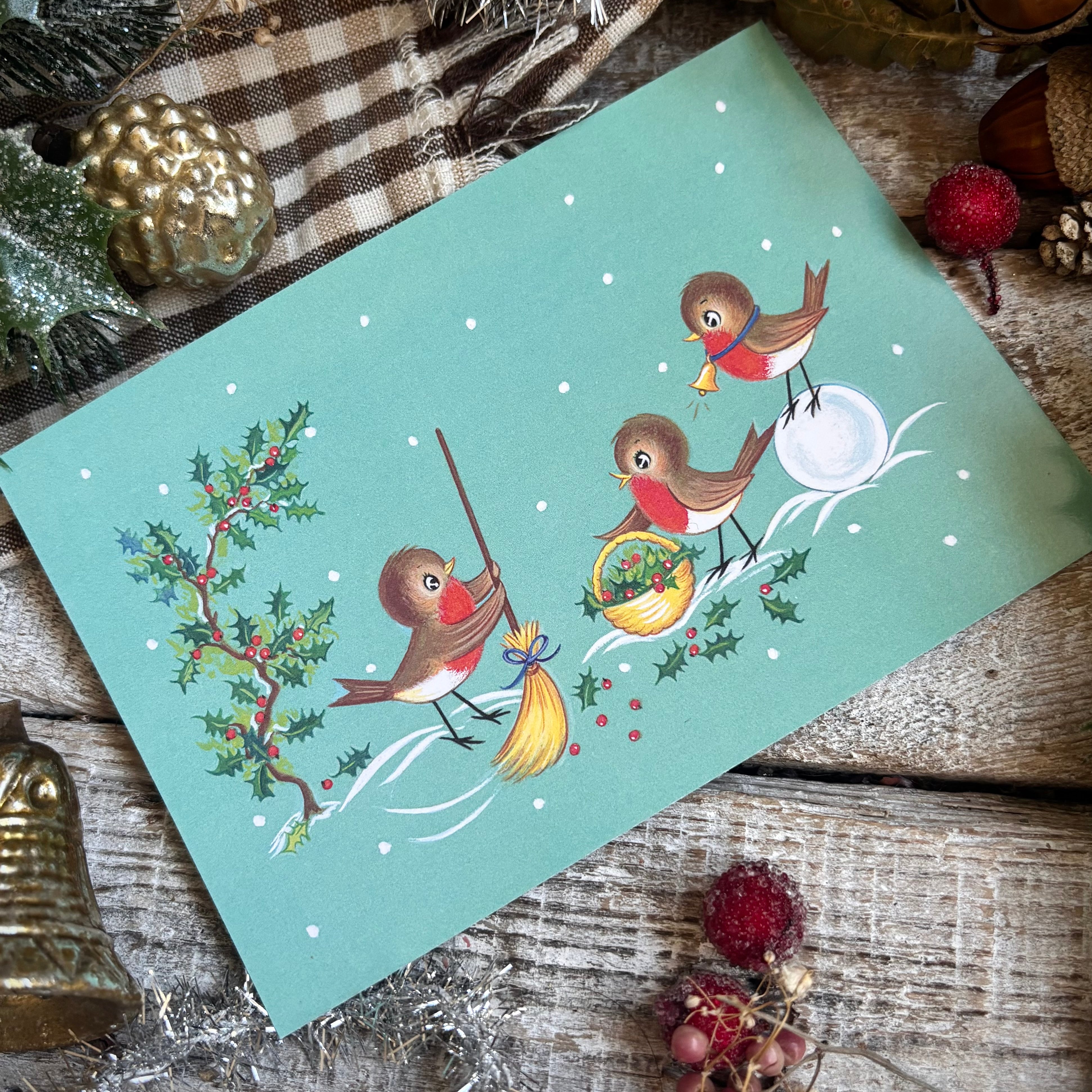 Christmas Postcard - Robins Collecting Holly And Ivy - Mary Adair R967