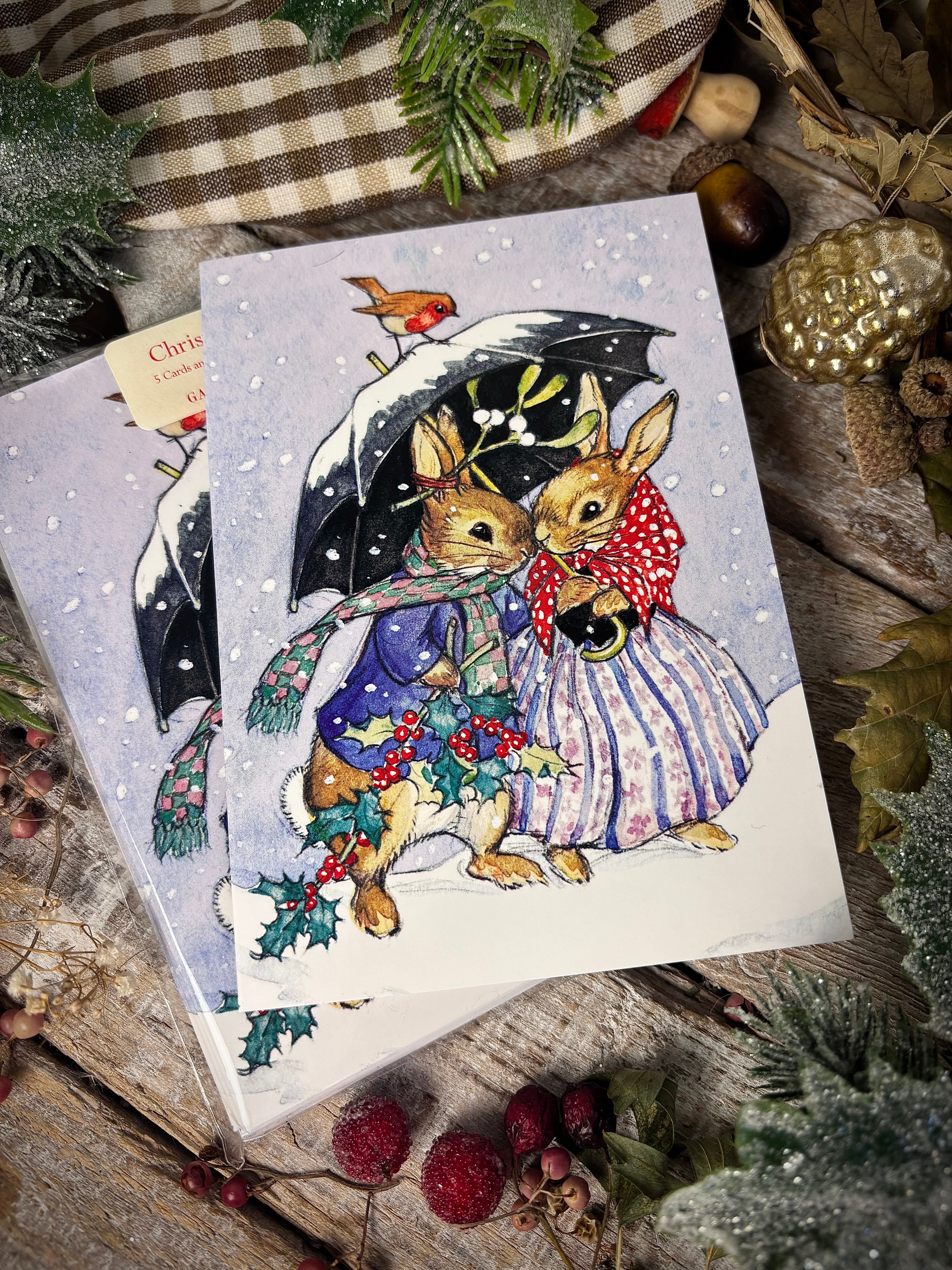 Pack Of Five Christmas Cards - Molly Brett - Two Bunnies Under Umbrella G399