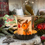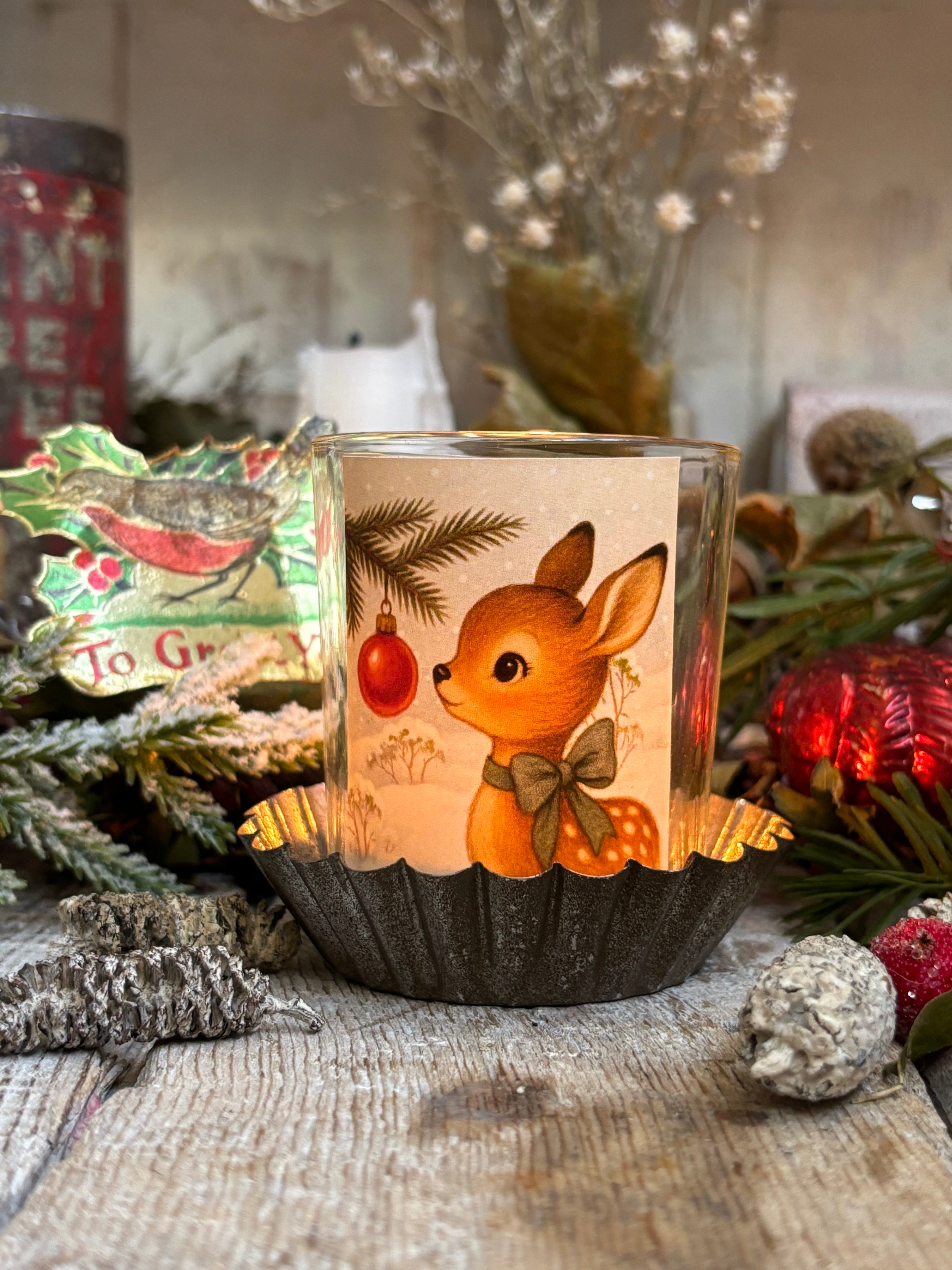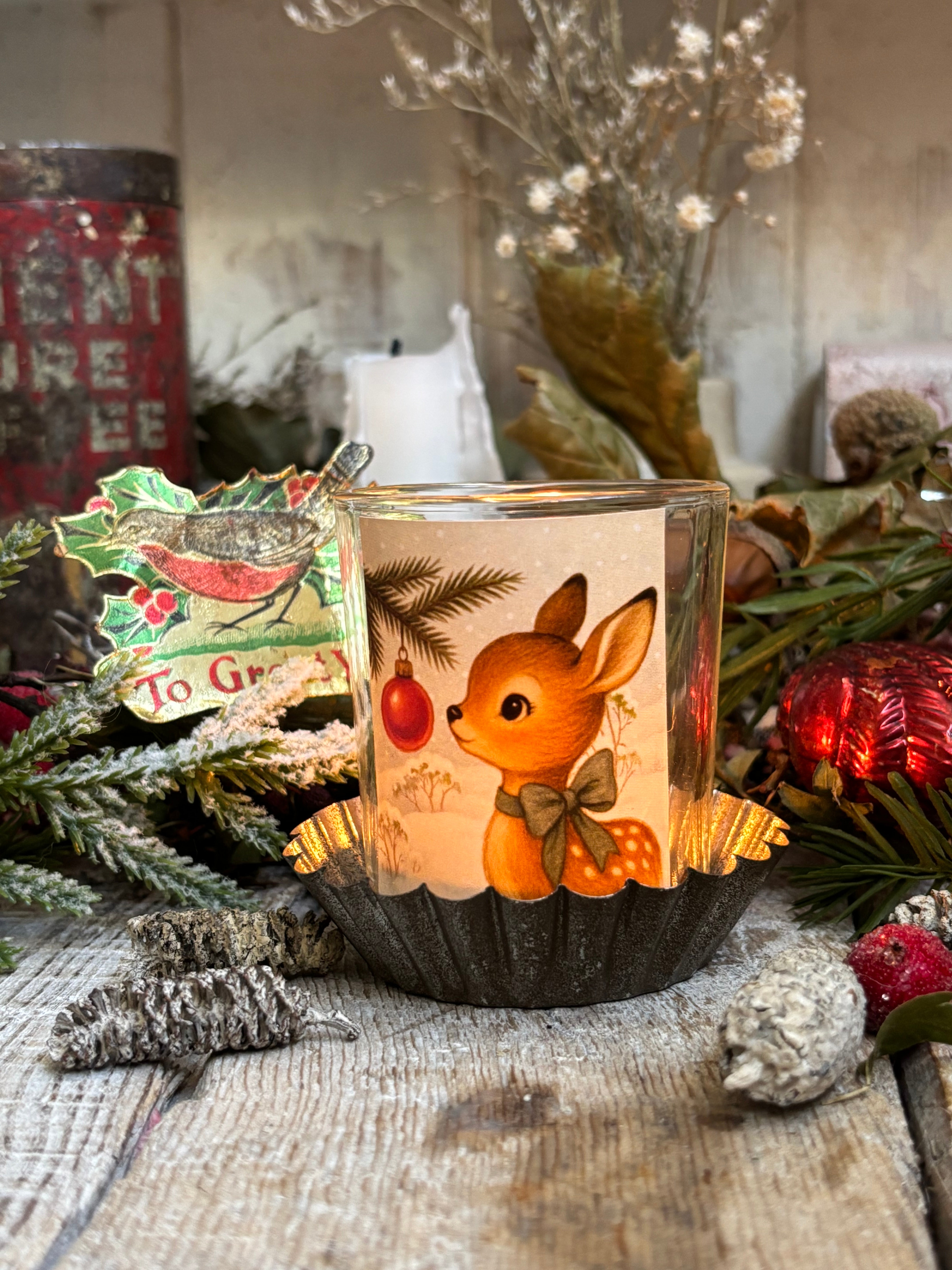 An intentionally distressed little tart tin designed to look aged, holding a mini glass candle jar.