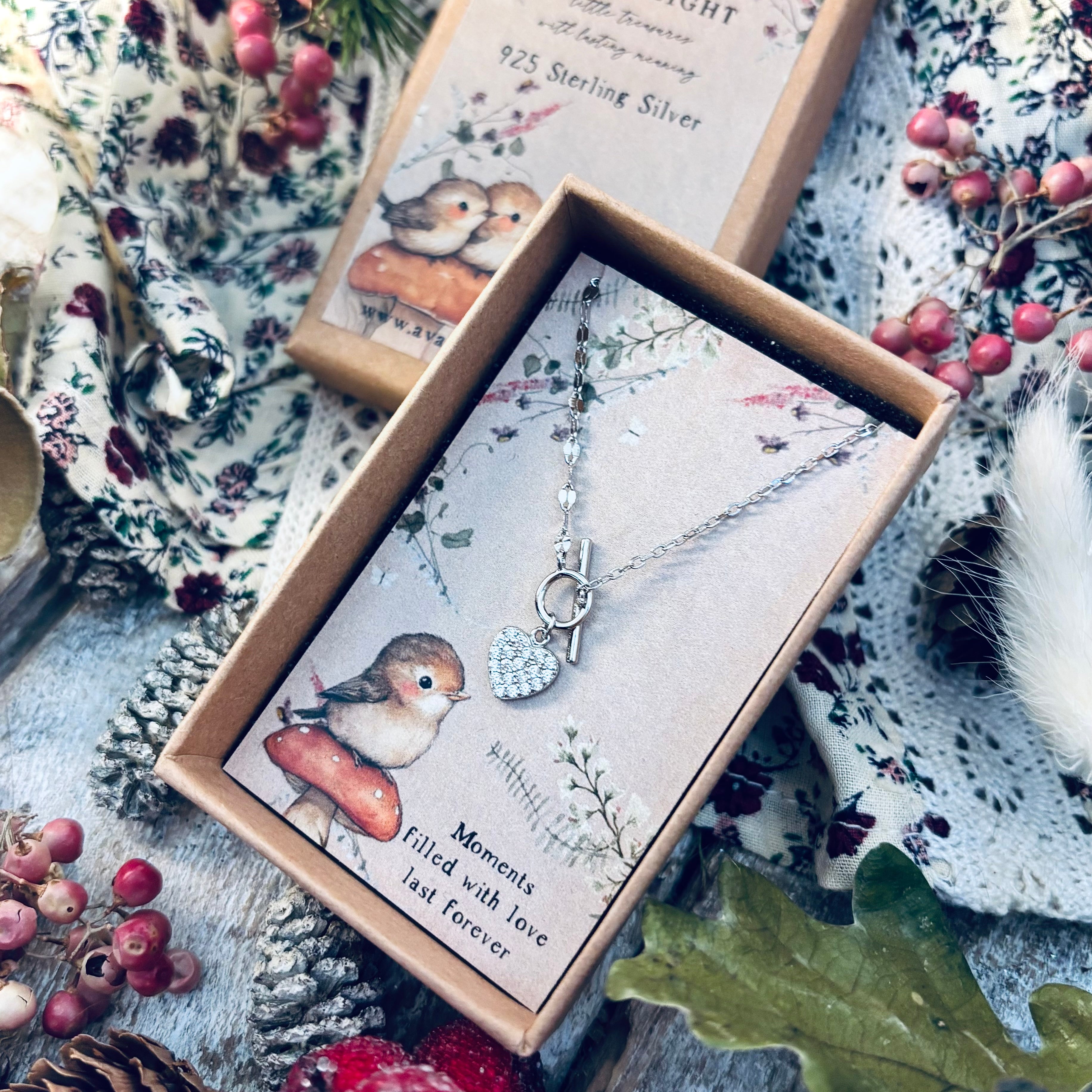 Tiny Light - 925 Sterling Silver T-Bar Sparkling Heart Necklace - Moments Filled With Love Last Forever