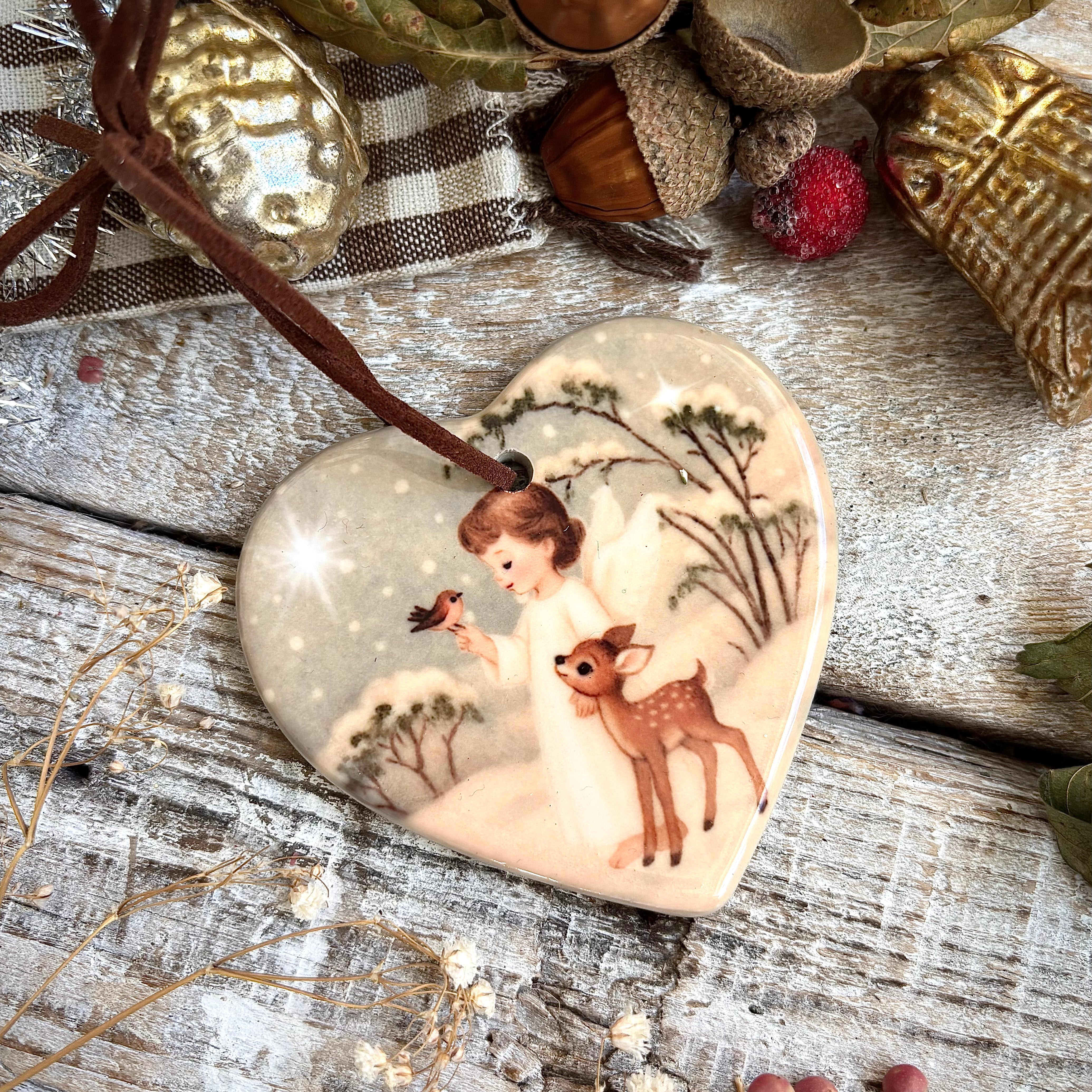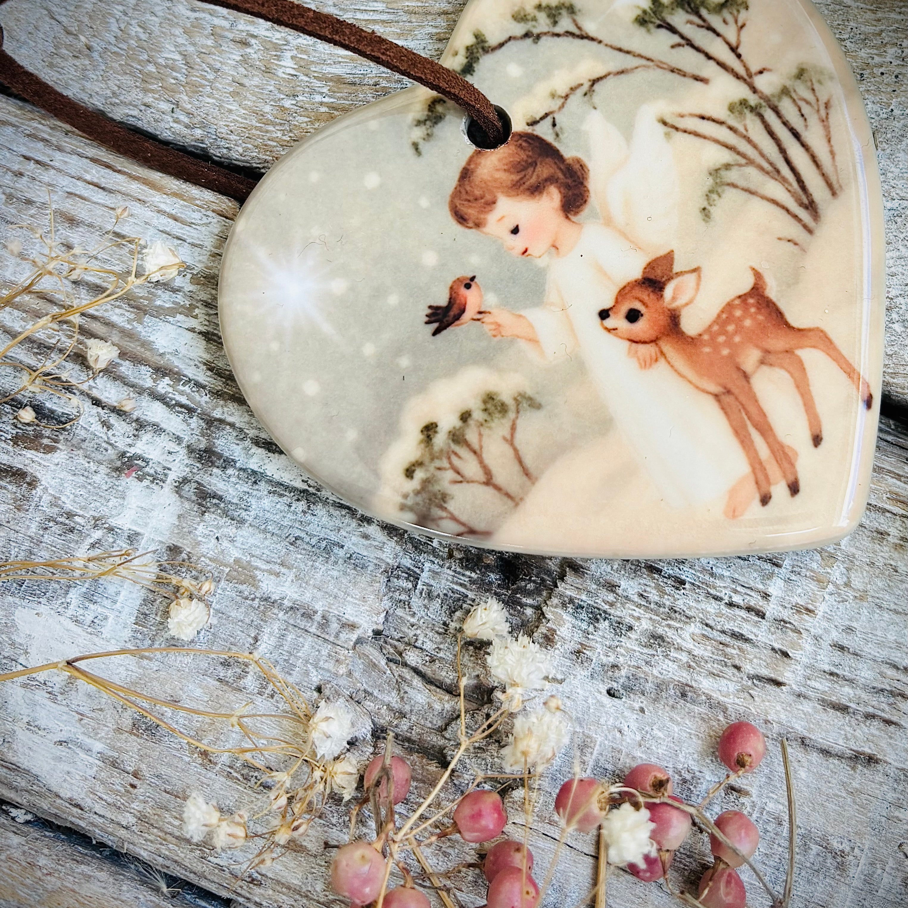 Christmas - Sweet Little Ceramic Heart - Always Close By, Angel With Deer And Robin