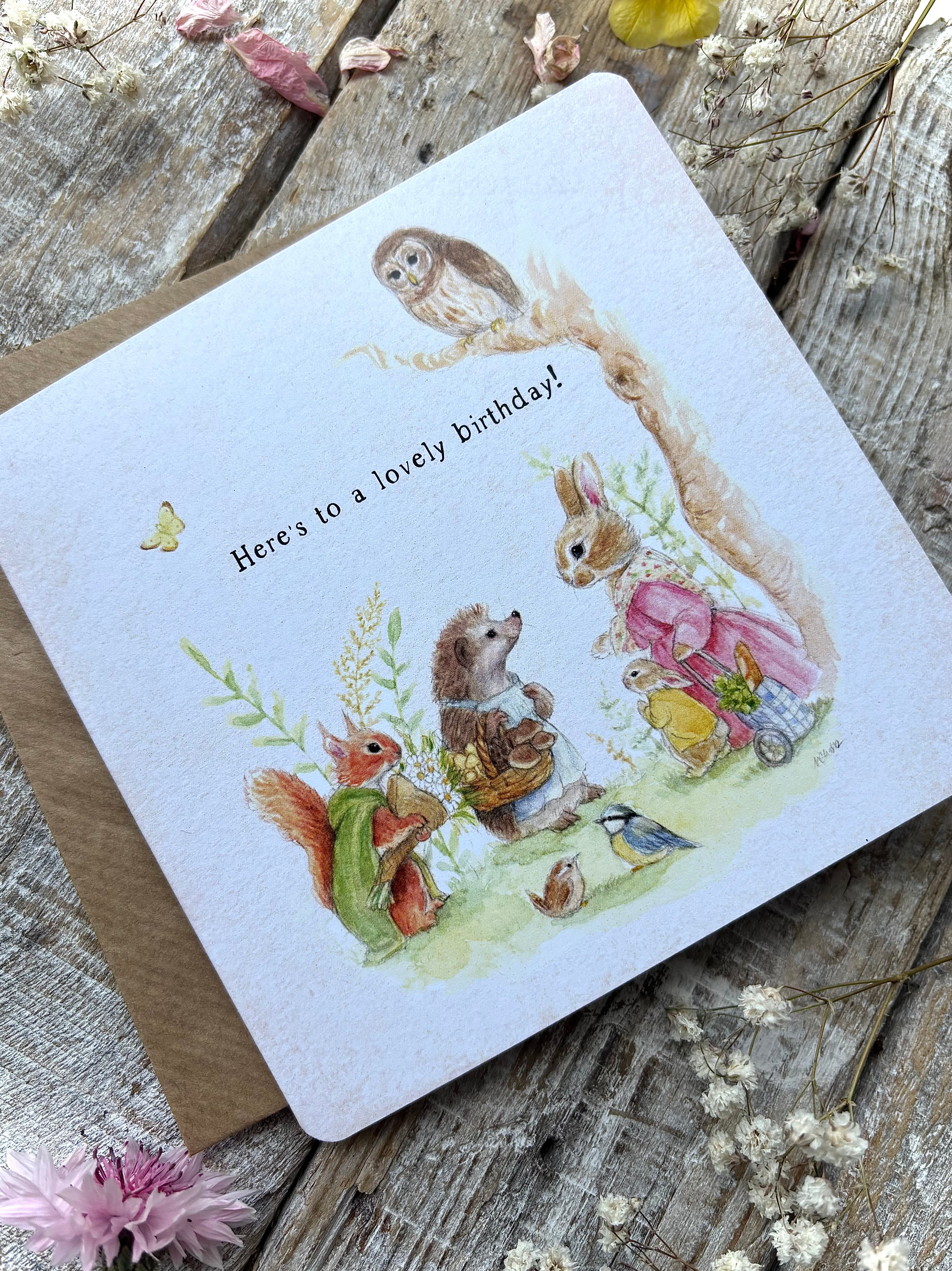 Measures approx. 12.5cm square. Blank inside for your own message. Recycled Kraft envelope included. These cards are printed on 300gsm card and feature gently rounded corners.