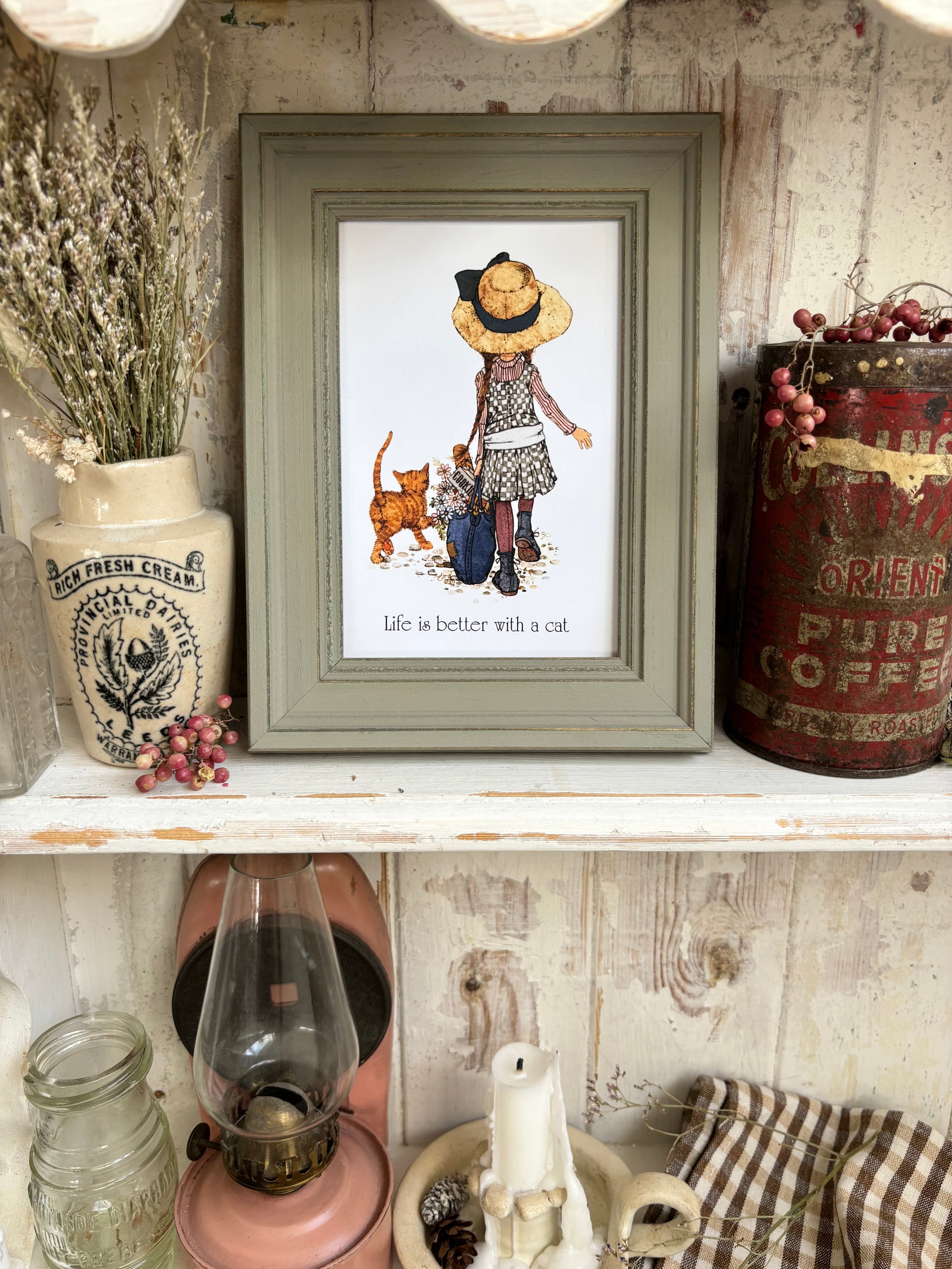 This Holly Hobbie postcards has been framed in a sweet, rustic style sage coloured frame.