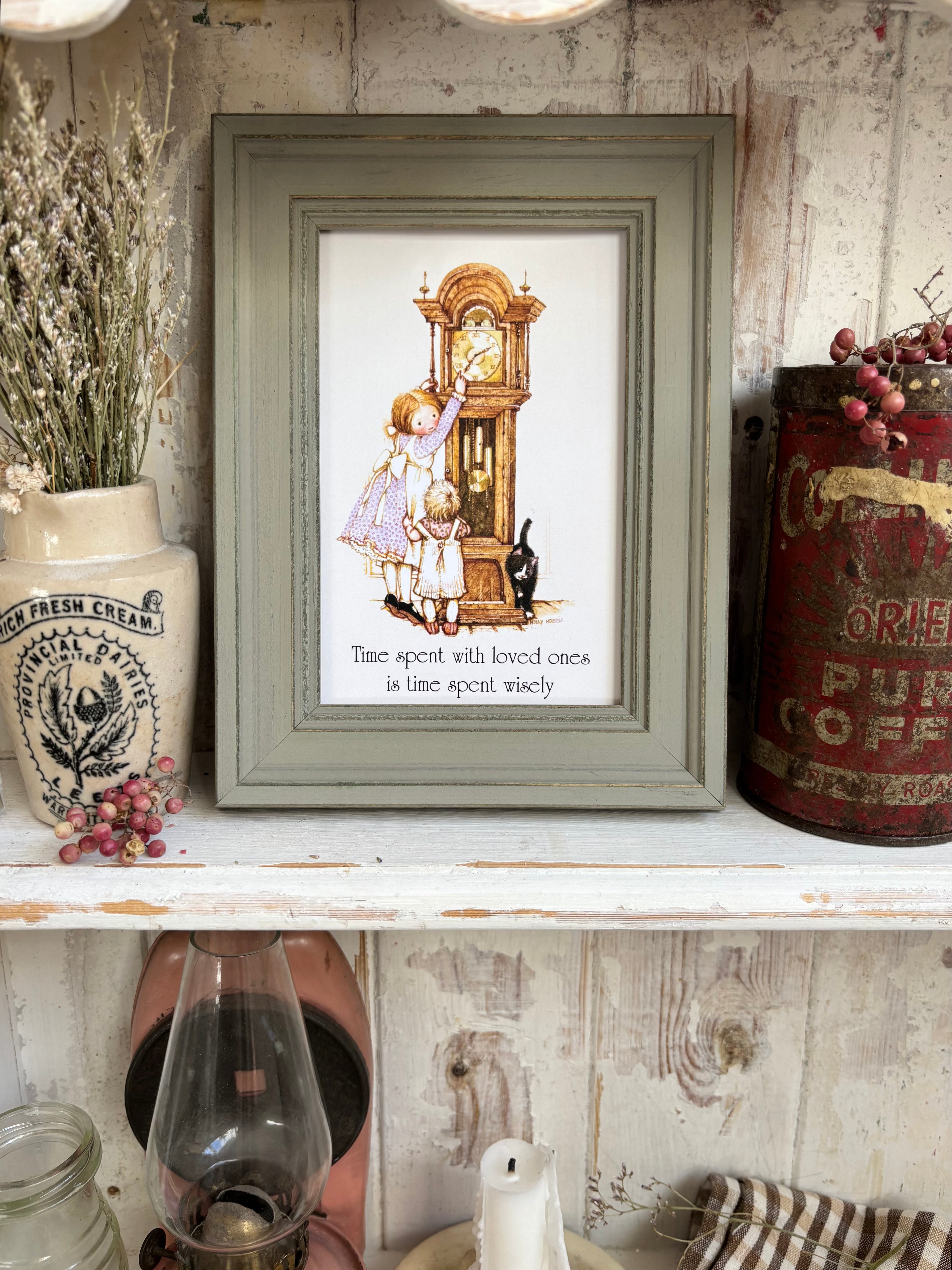 This Holly Hobbie postcards has been framed in a sweet, rustic style sage coloured frame.