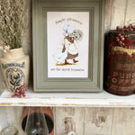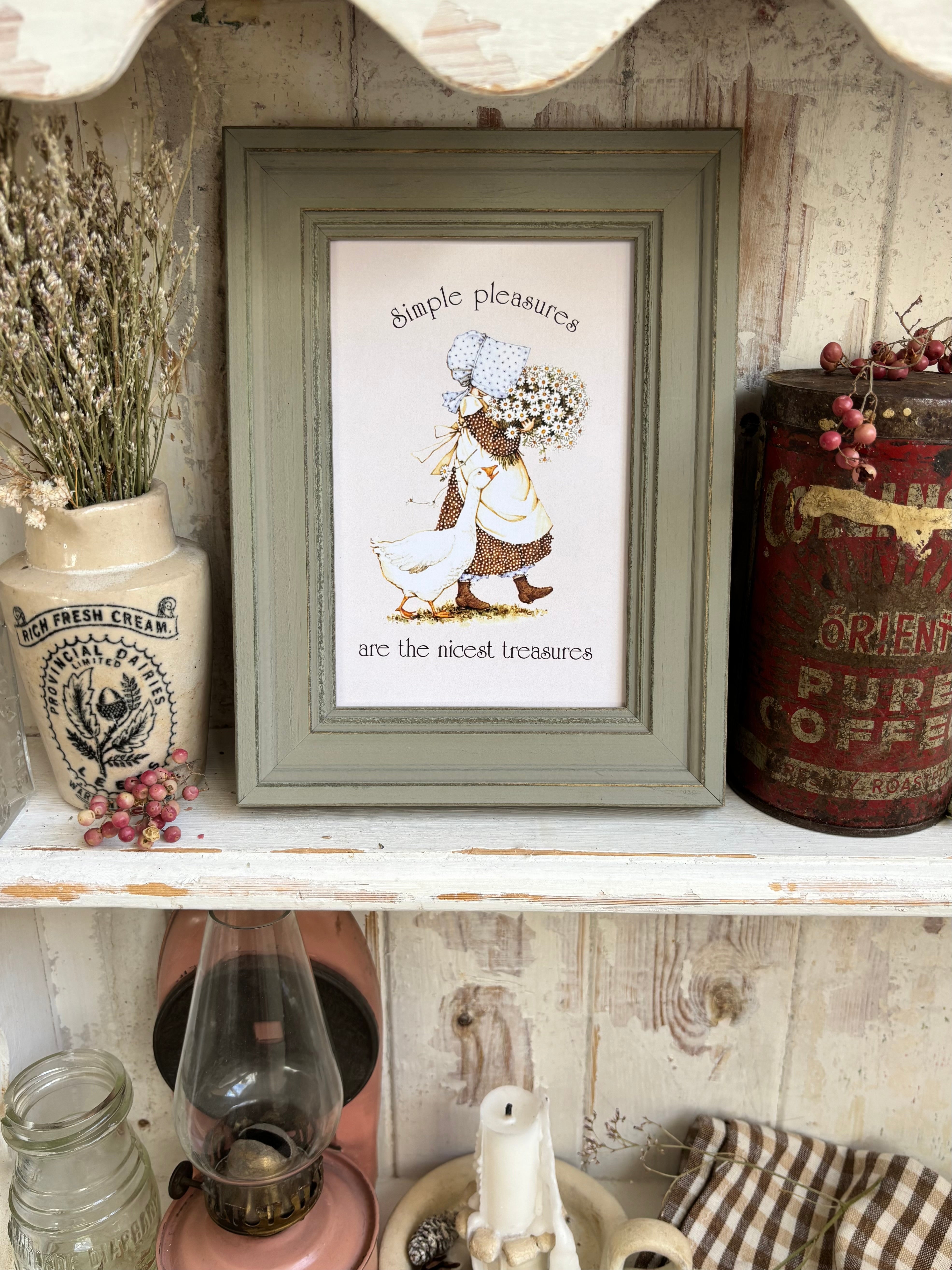 This Holly Hobbie postcards has been framed in a sweet, rustic style sage coloured frame.