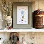 This Holly Hobbie postcards has been framed in a sweet, rustic style sage coloured frame.