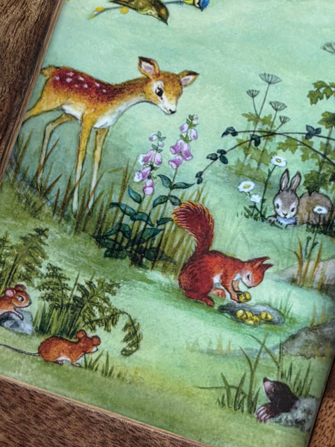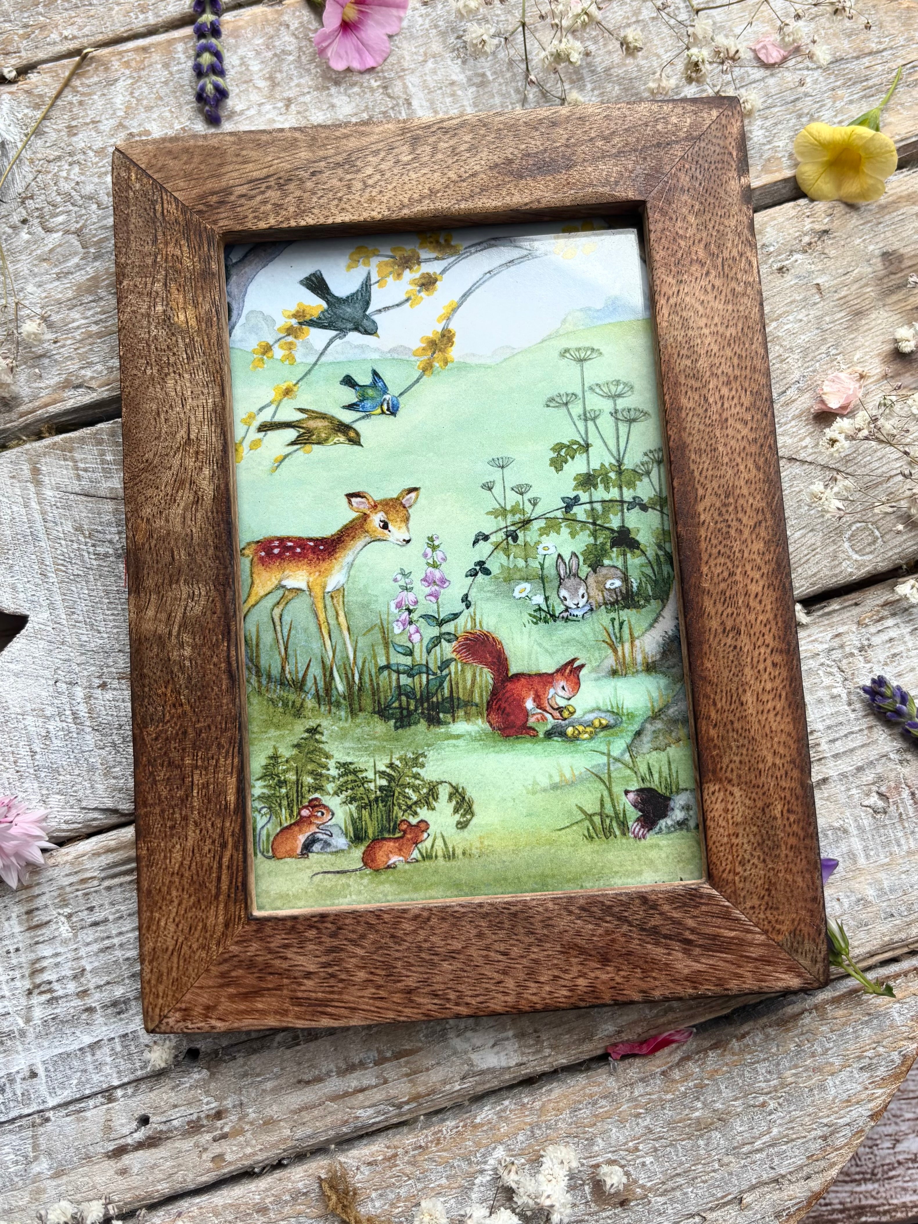 This beautiful Squirrel With Nuts & Fawn postcard by The Medici Society has been framed in a sweet, rustic style wooden frame.