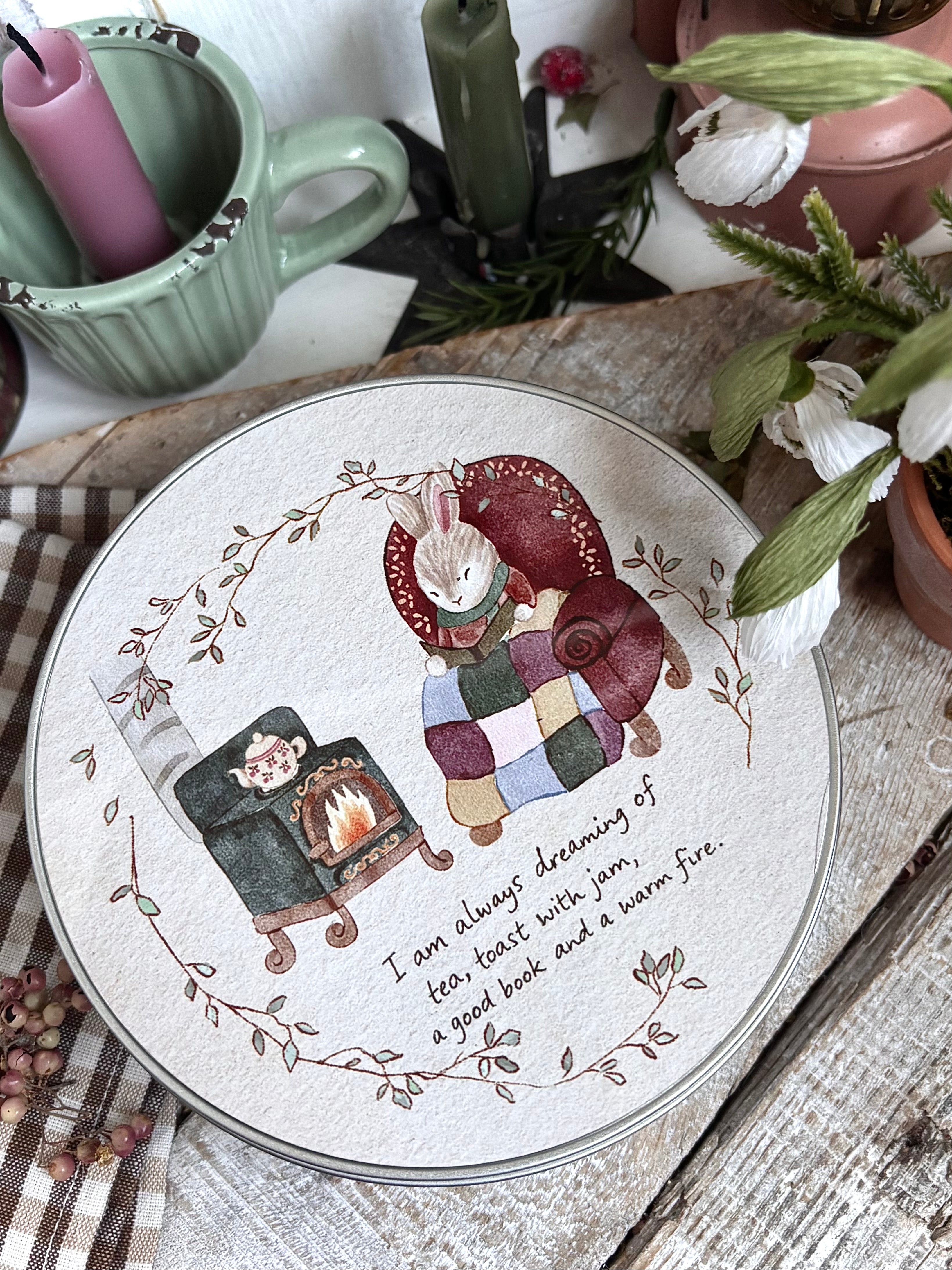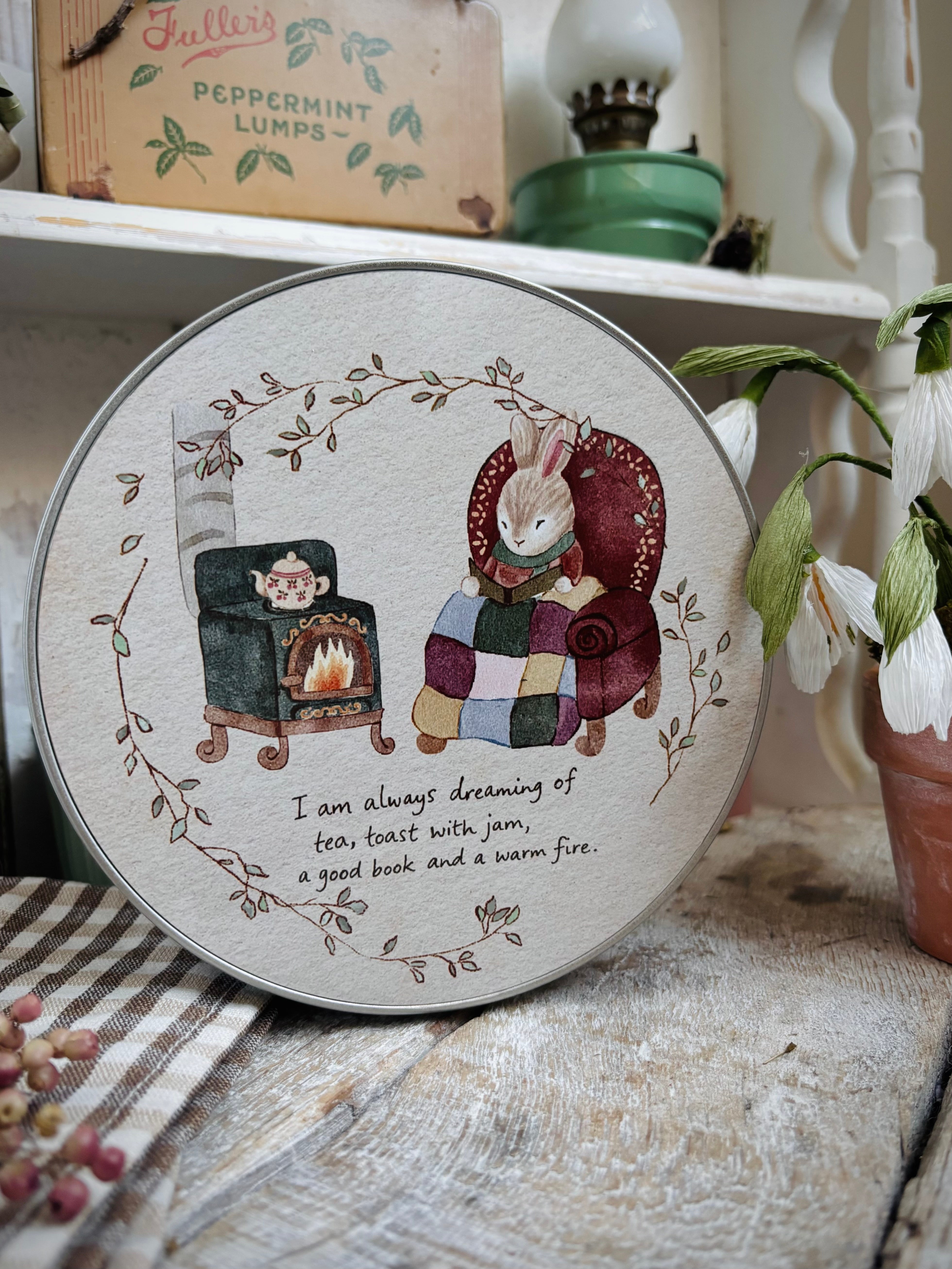 A pretty tin measuring approx 15cm across…Perfect for hiding away cookies, sweets or little cakes. You could equally use it to store buttons, craft supplies, odds and ends… Always useful for something!