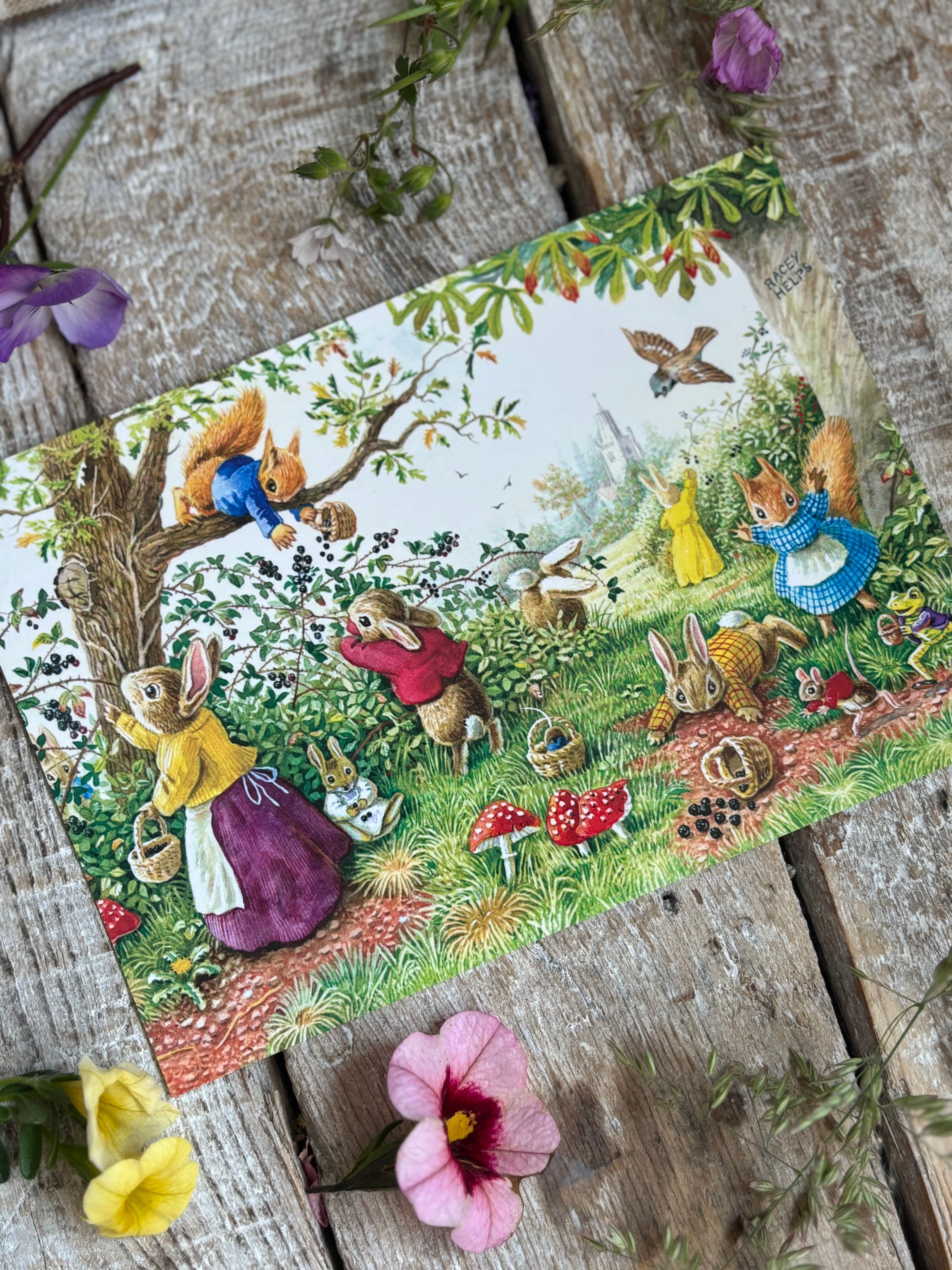 Racey Helps. 1913-71. A Somerset-born antiquarian book-dealer. A course at the West of England College of Art set him on a career as an author and illustrator of children's books and his charming artwork featuring an array of anthropomorphic woodland animals was widely reproduced as postcards and greeting cards.