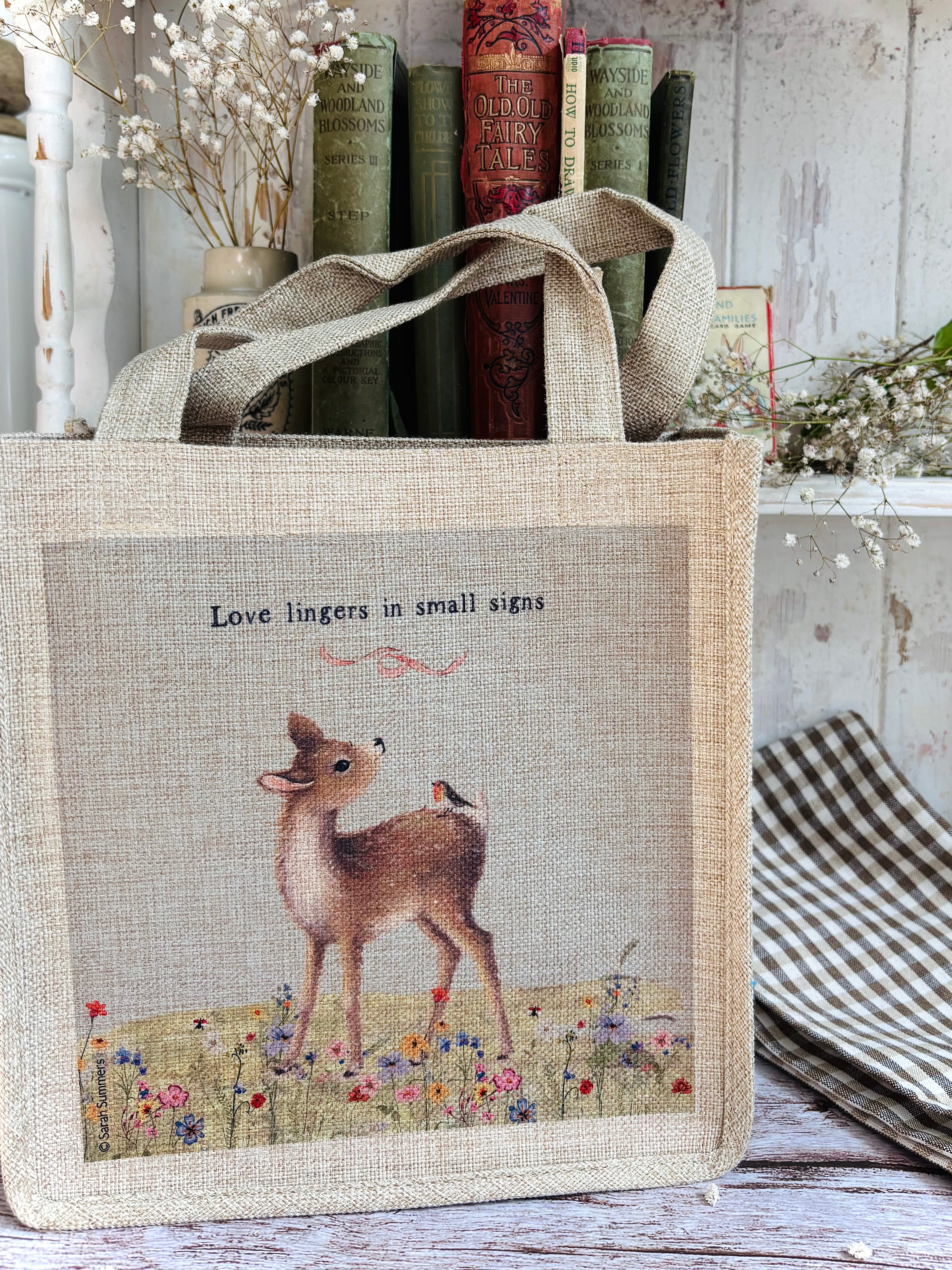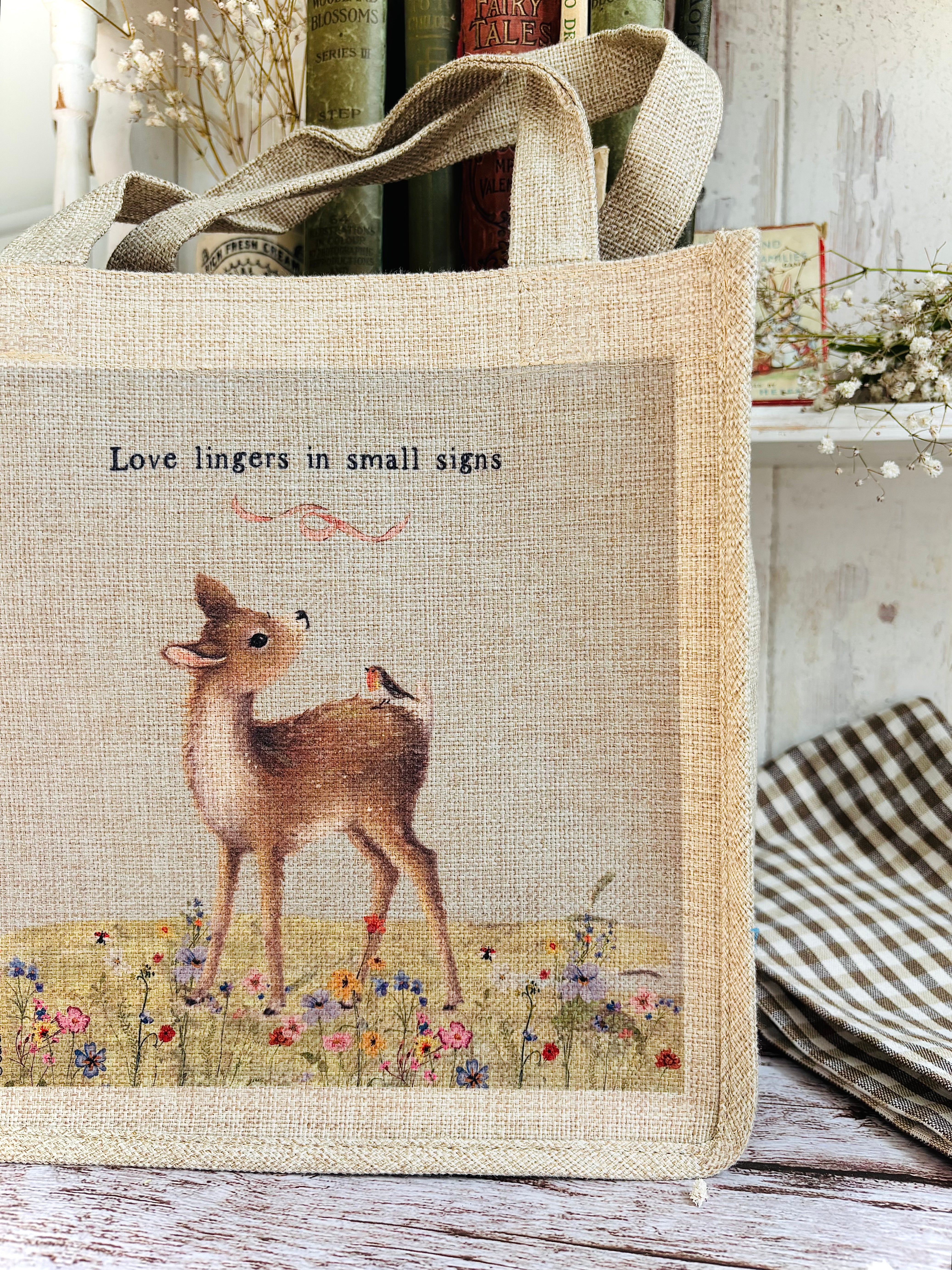 Measuring 25cm by 25cm with a 10cm gusset, this adorable little bag is made from burlap style fabric. It features the sweetest deer and robin design and would be perfect for taking snacks/lunch to work or carrying a few stationery essentials.