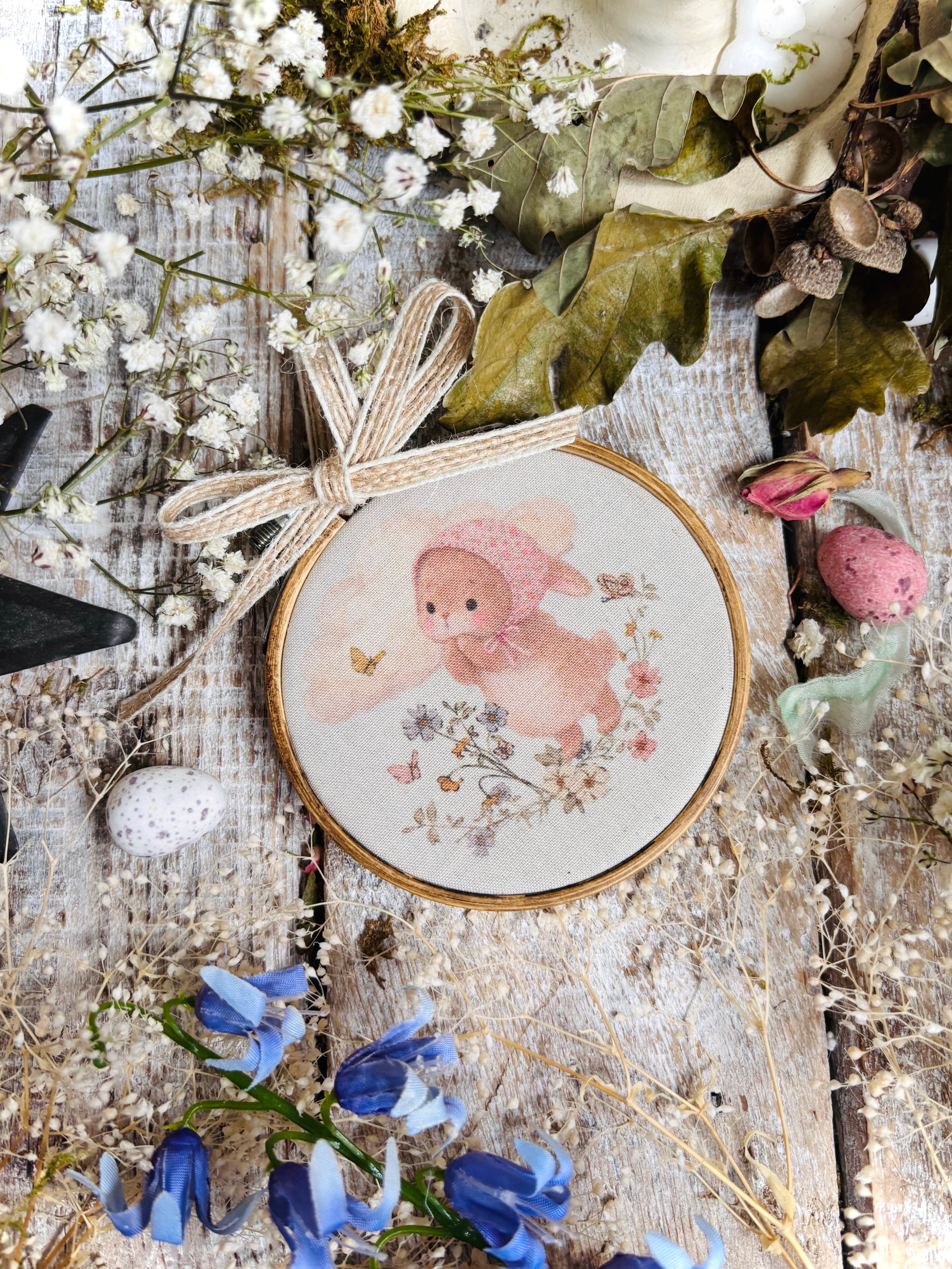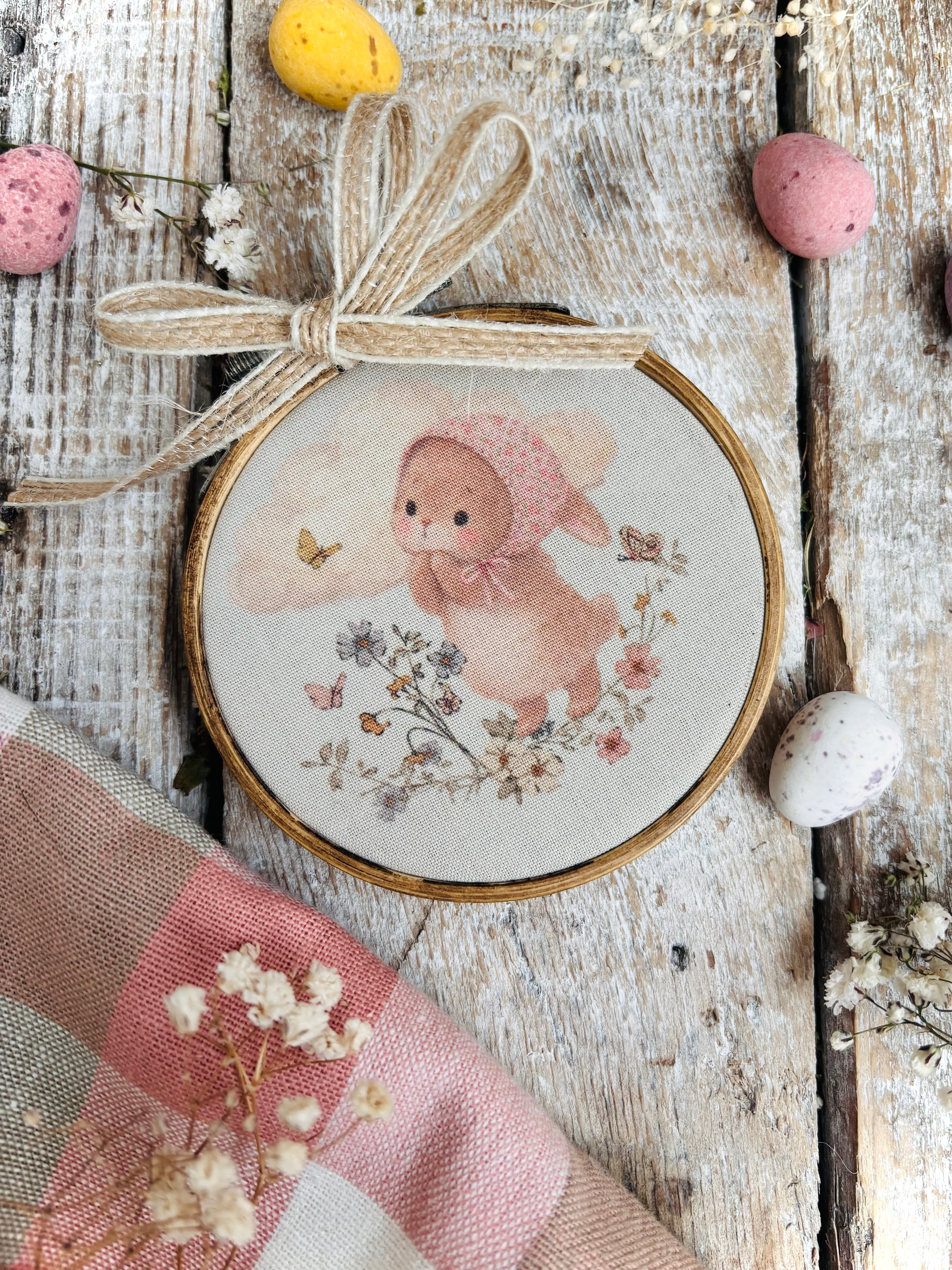 In a sweet, waxed rustic style hoop measuring approx 3 inches across, finished with a hessian bow.