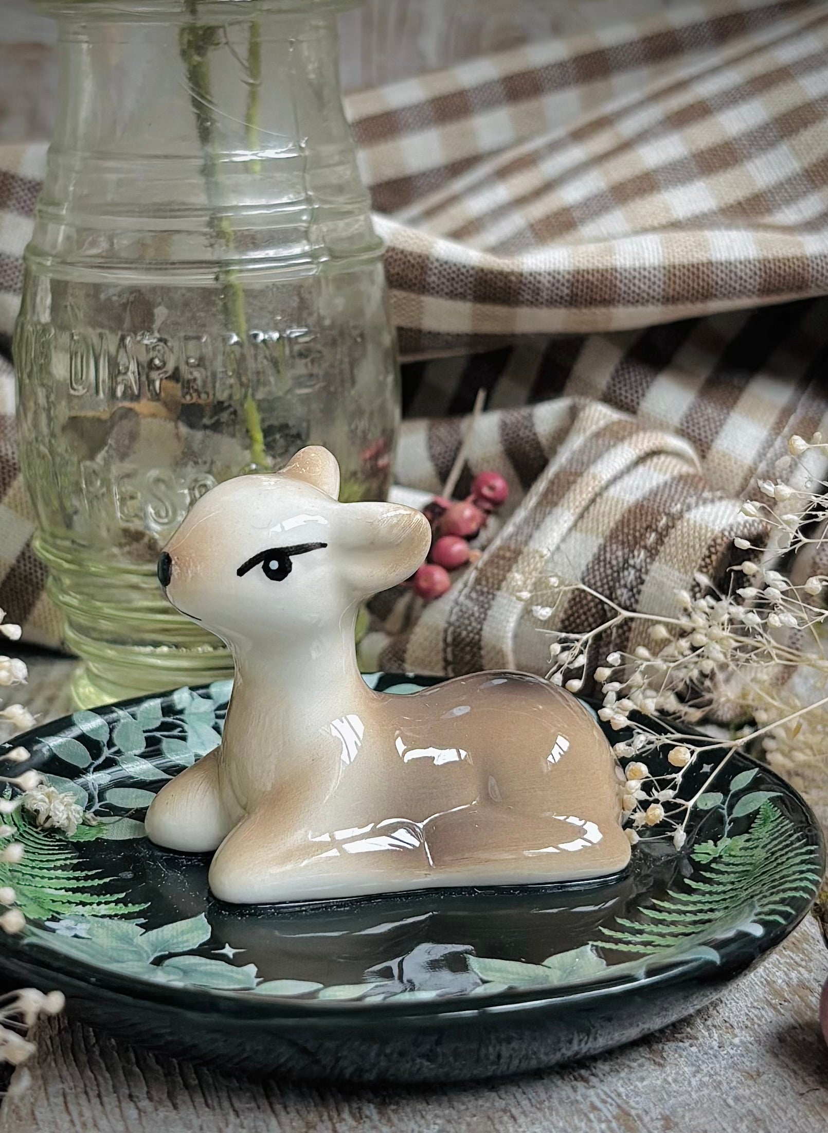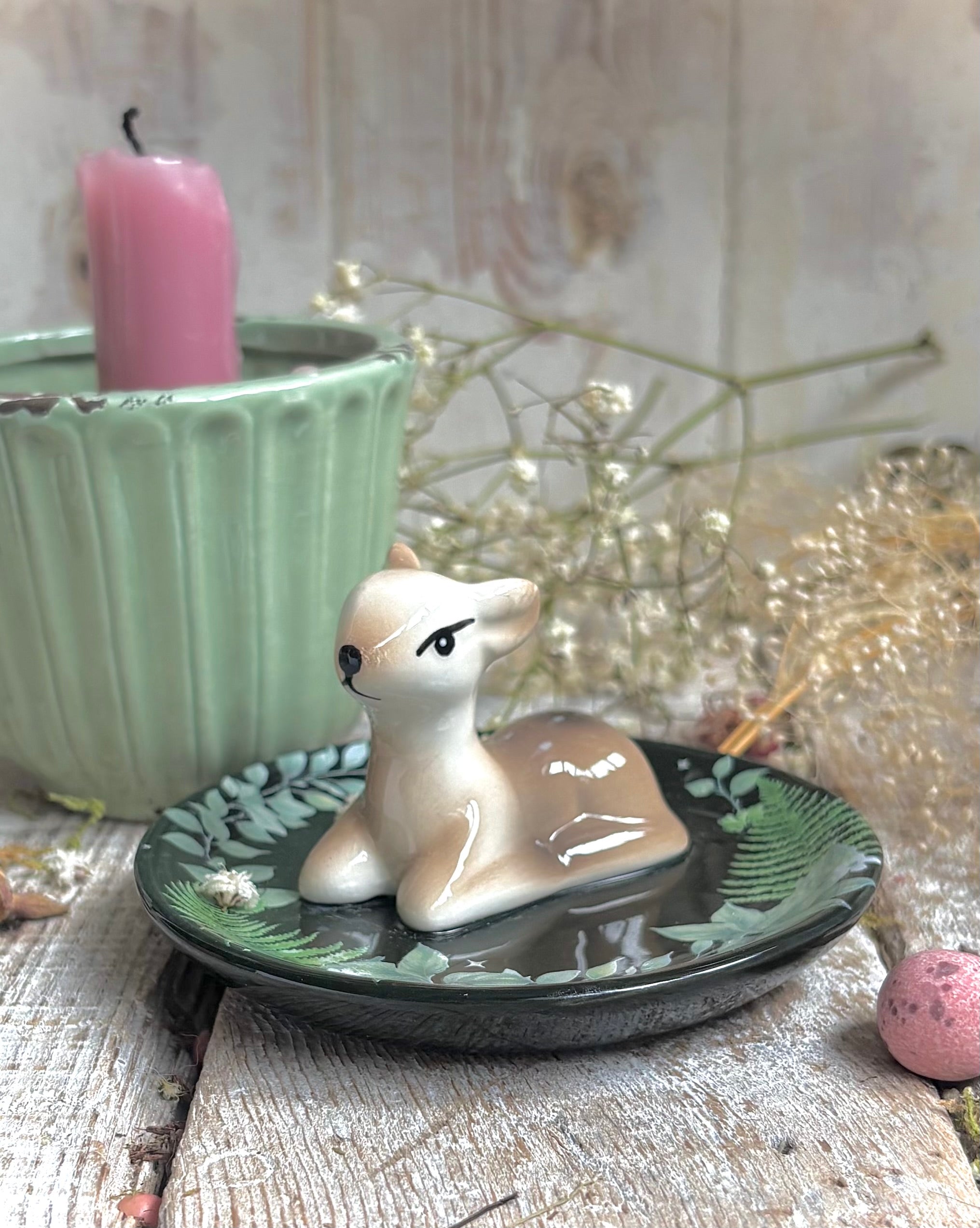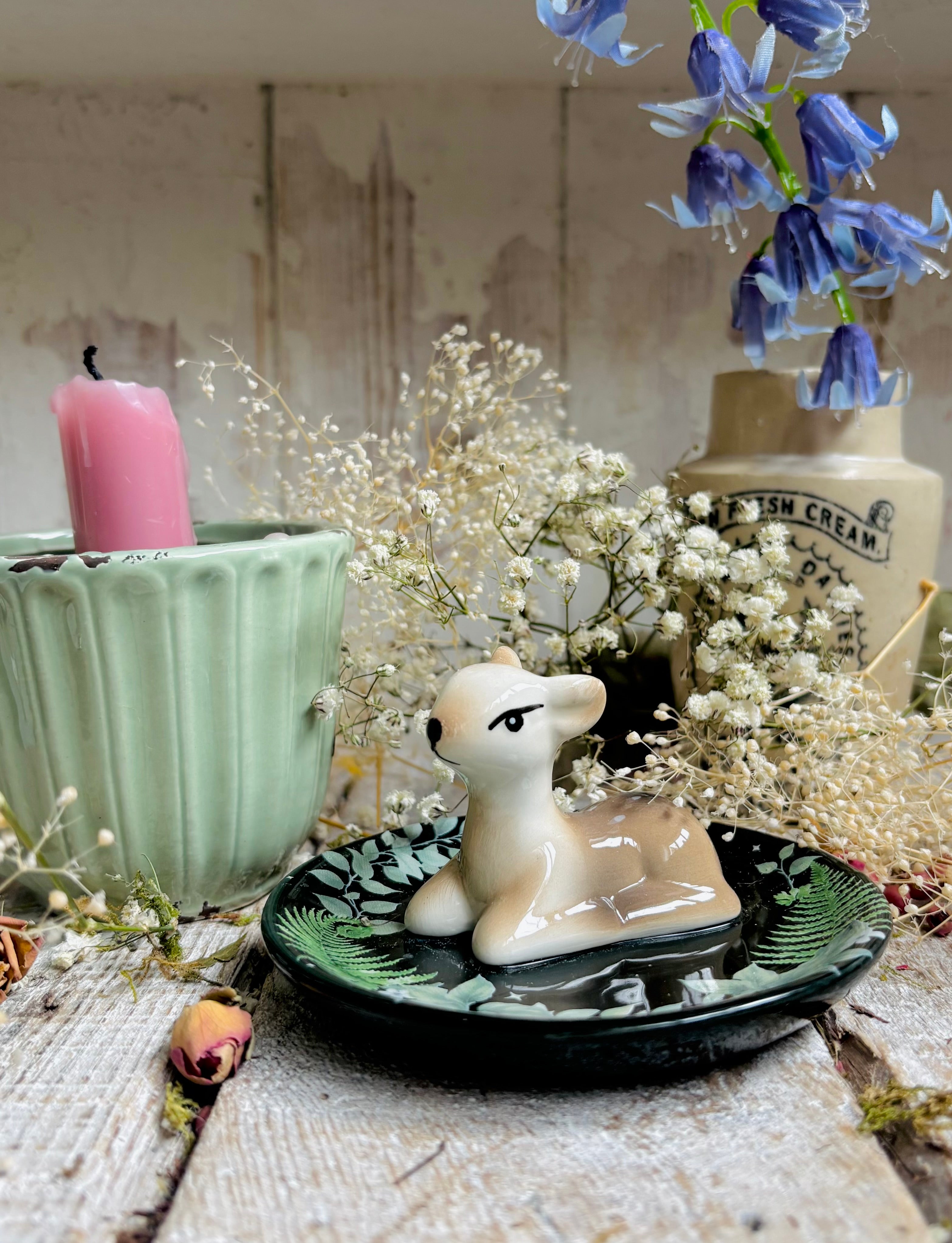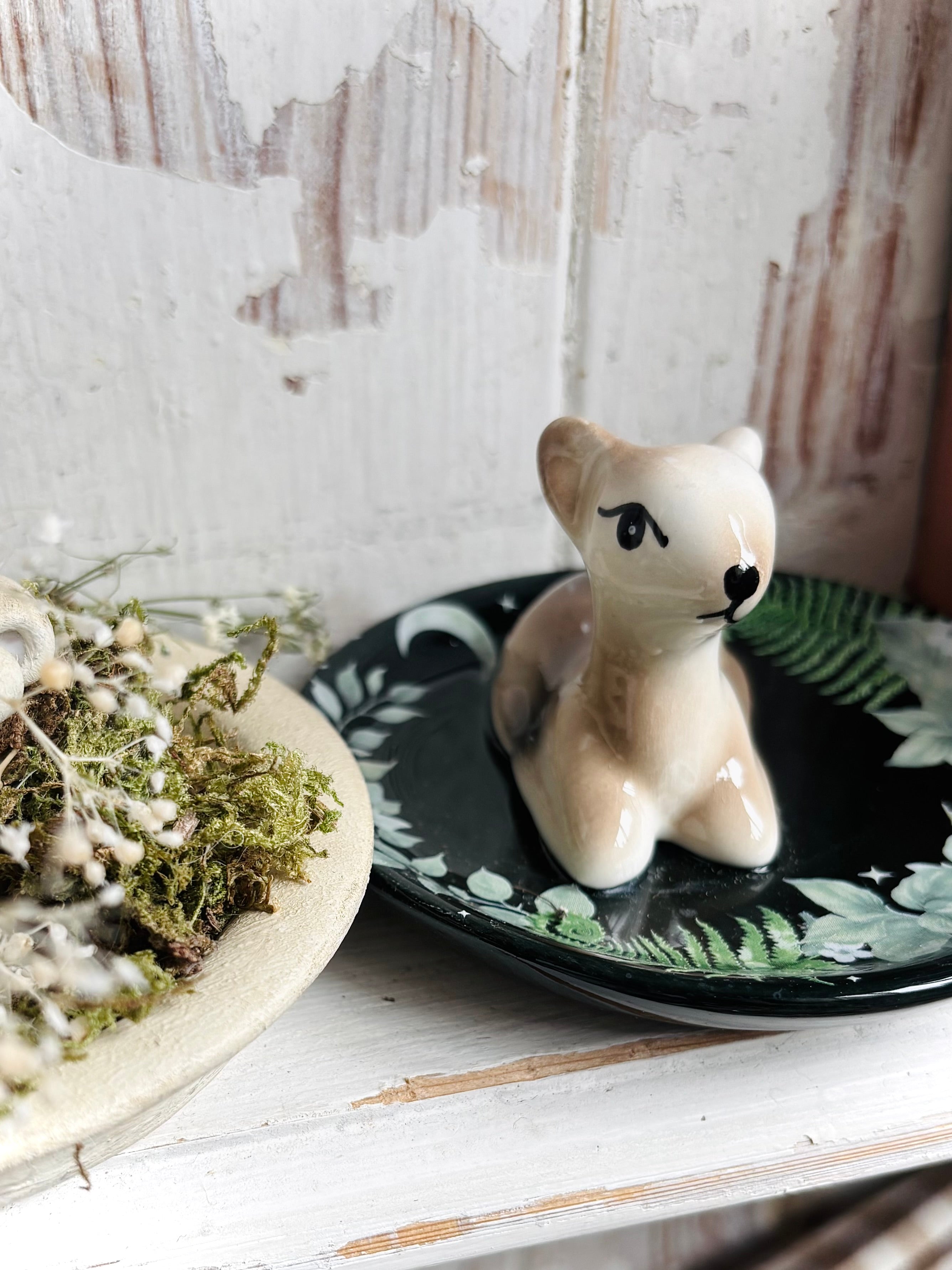 The pretty little woodland fawn sits on a trinket dish - perfect for storing rings, keys, or tiny keepsakes.