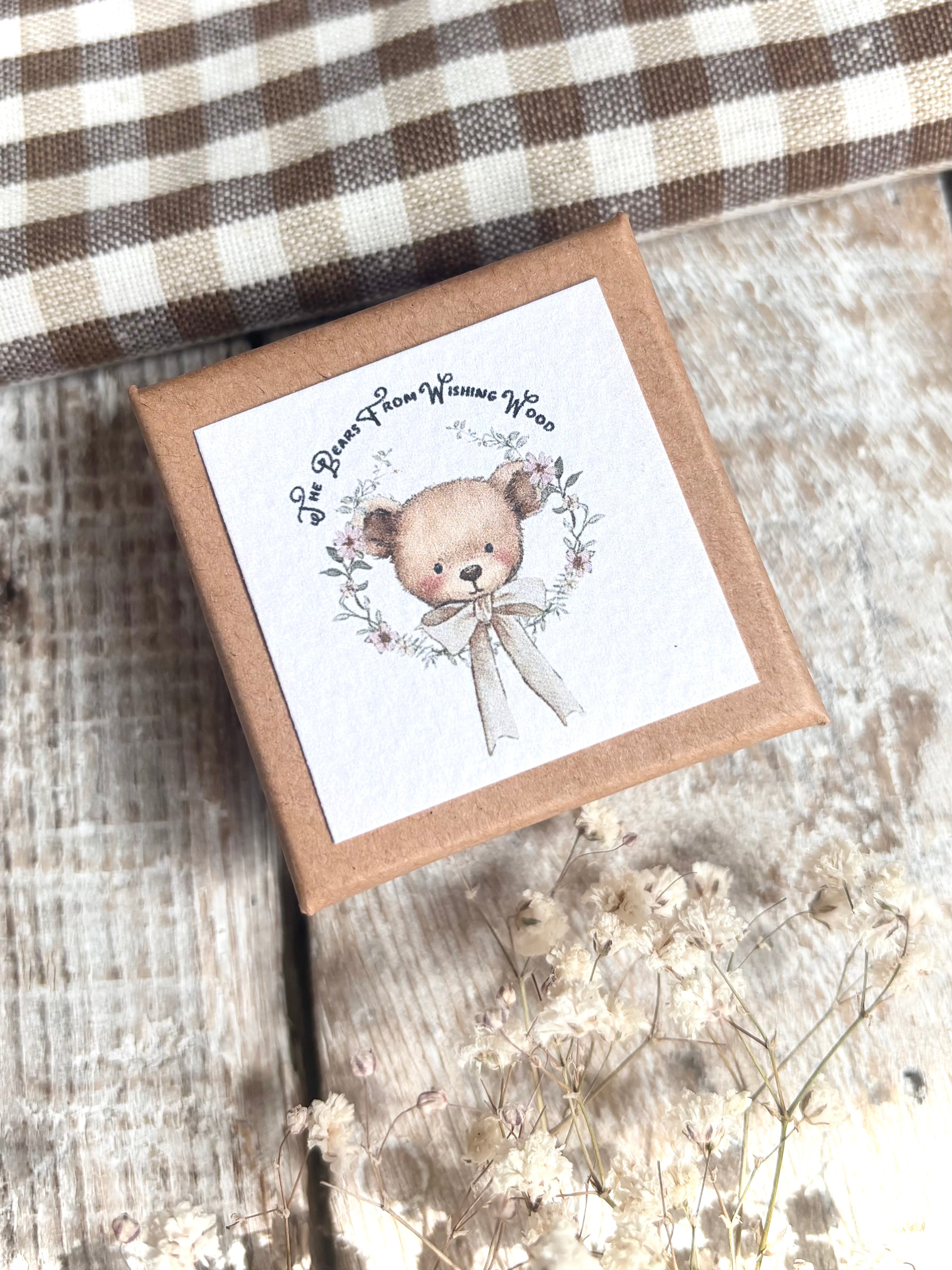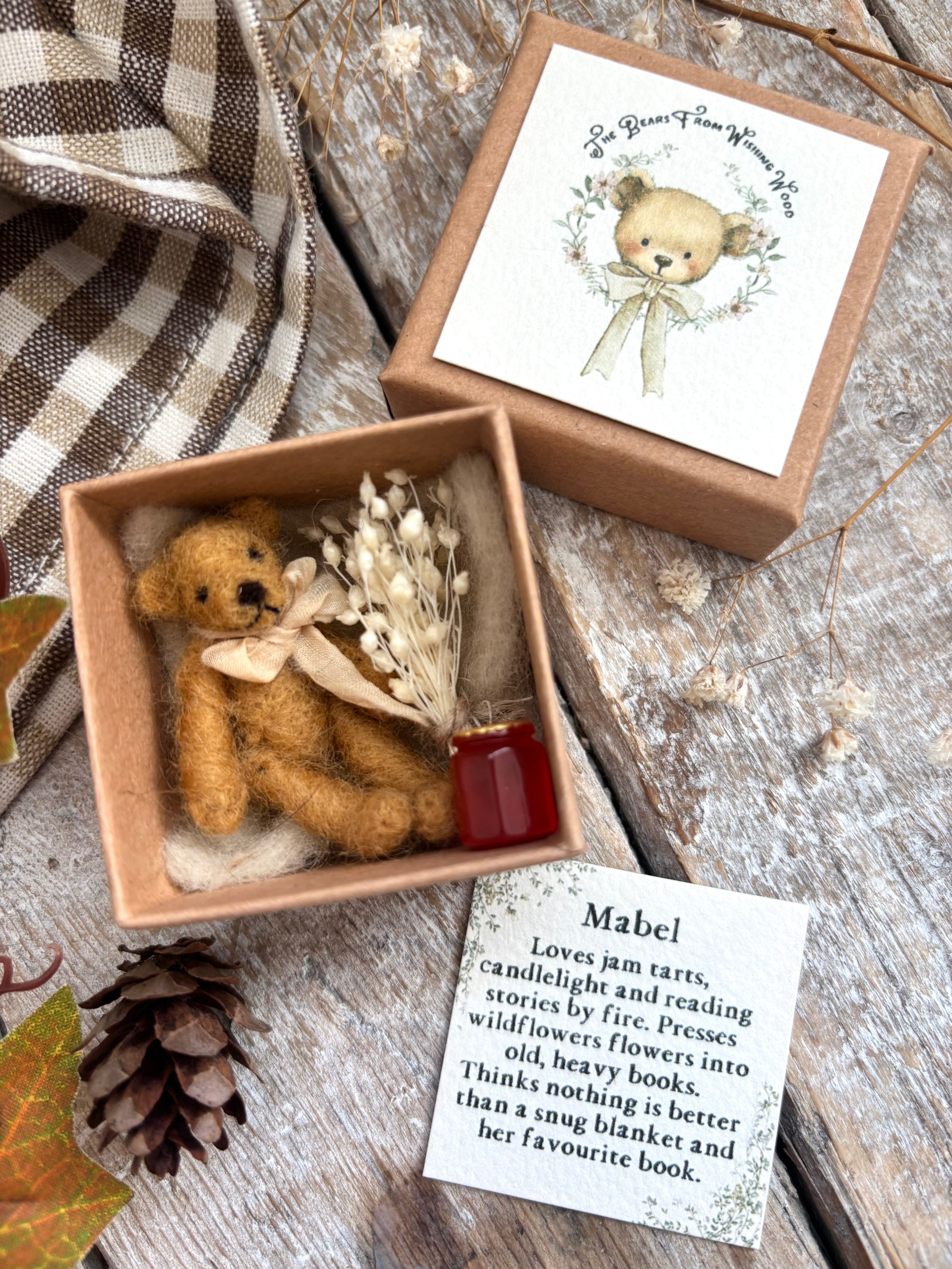 Lovingly handmade from carded wool, each tiny bear is slowly and gently needle felted. Complete with their own little name card, and two of their favourite things - a tiny bunch of flowers and a jar of jam.