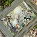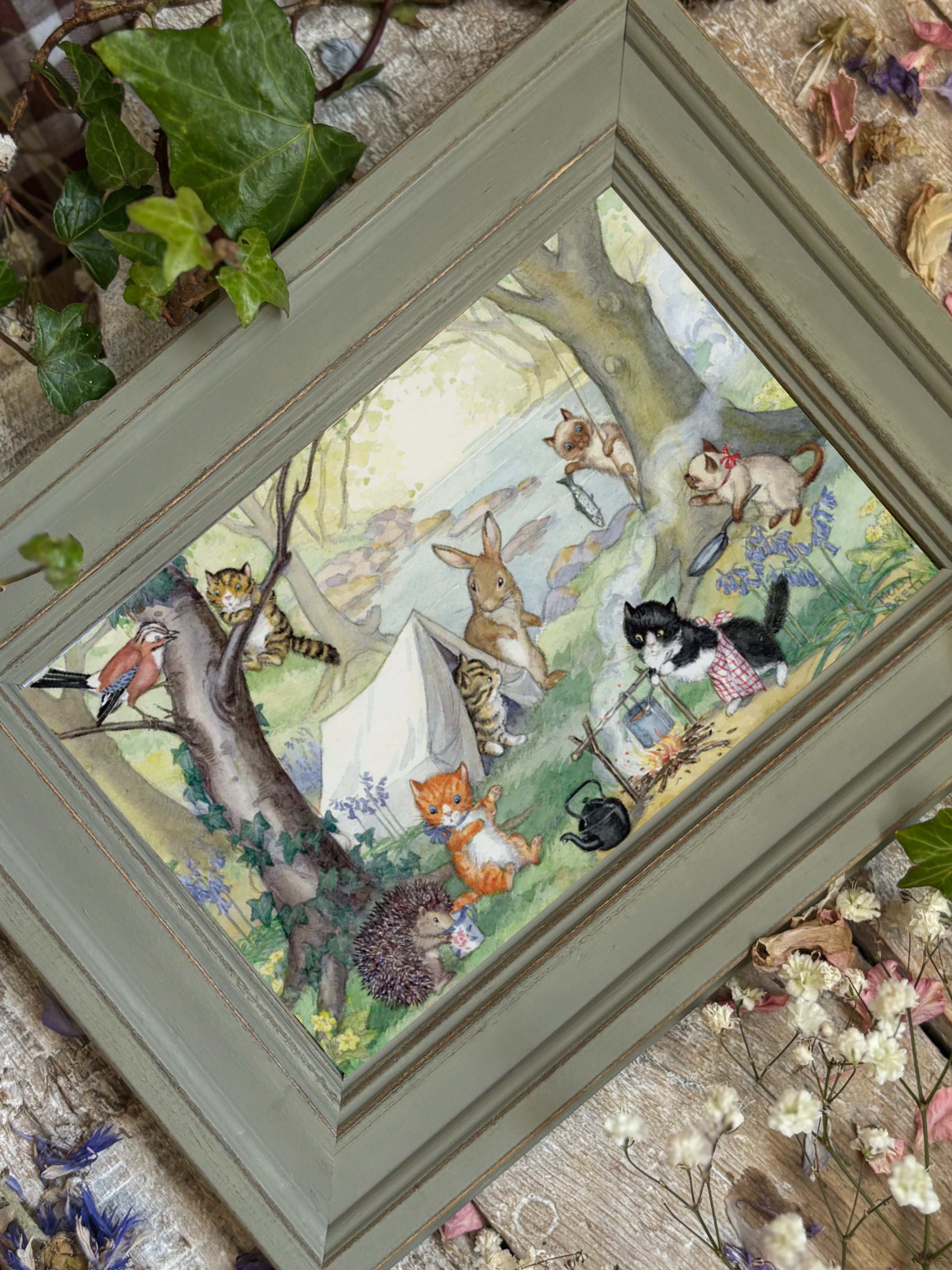 This beautiful Kitten Camp Molly Brett postcard by The Medici Society has been framed in a sweet, rustic style sage coloured frame.