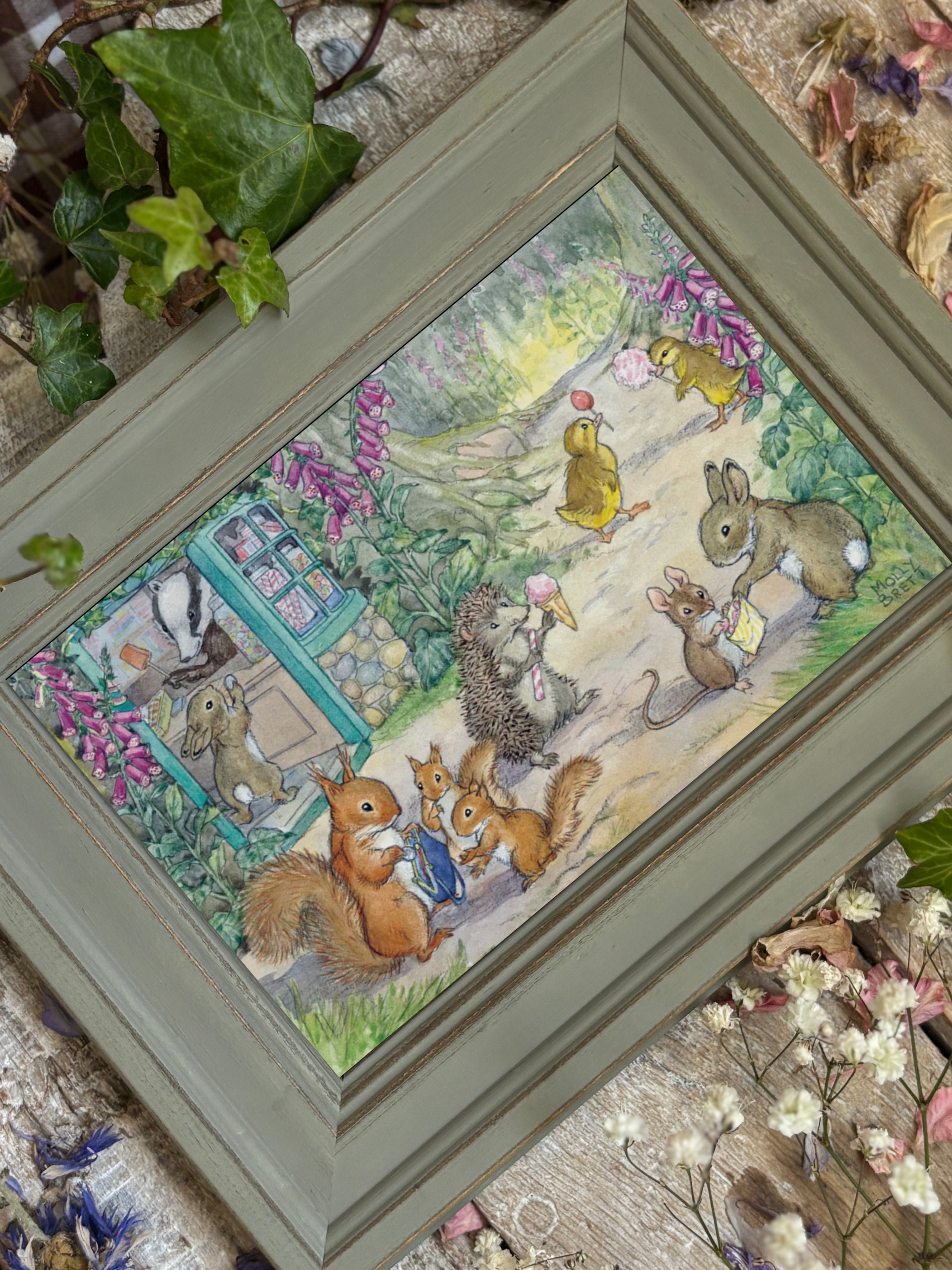 This beautiful Lollipops Molly Brett postcard by The Medici Society has been framed in a sweet, rustic style sage coloured frame.
