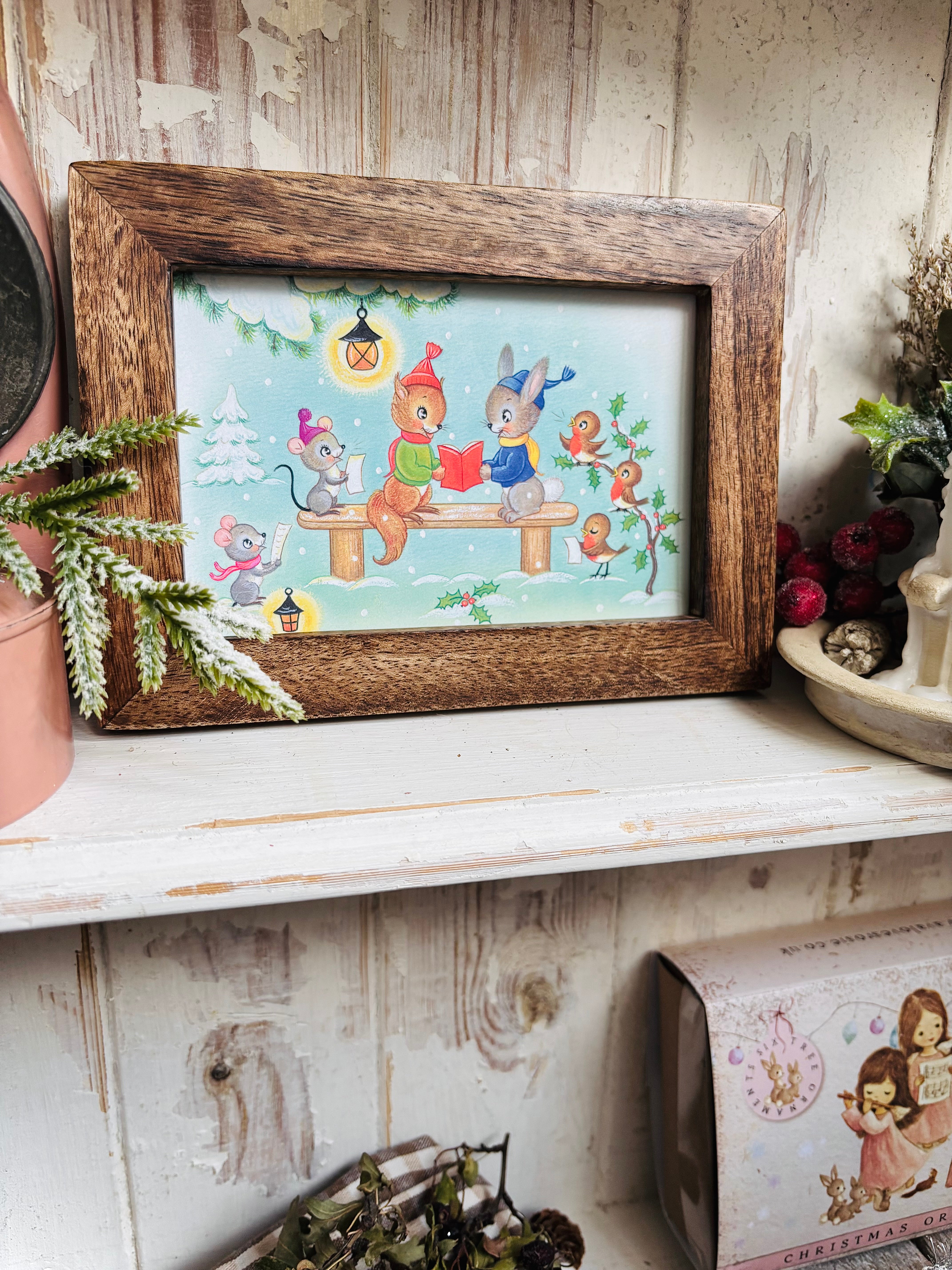A cute postcard by Mary Adair for The Medici Society, framed in a lovely rustic style wooden frame. Full of joyful, warm and fuzzy Christmas nostalgia!