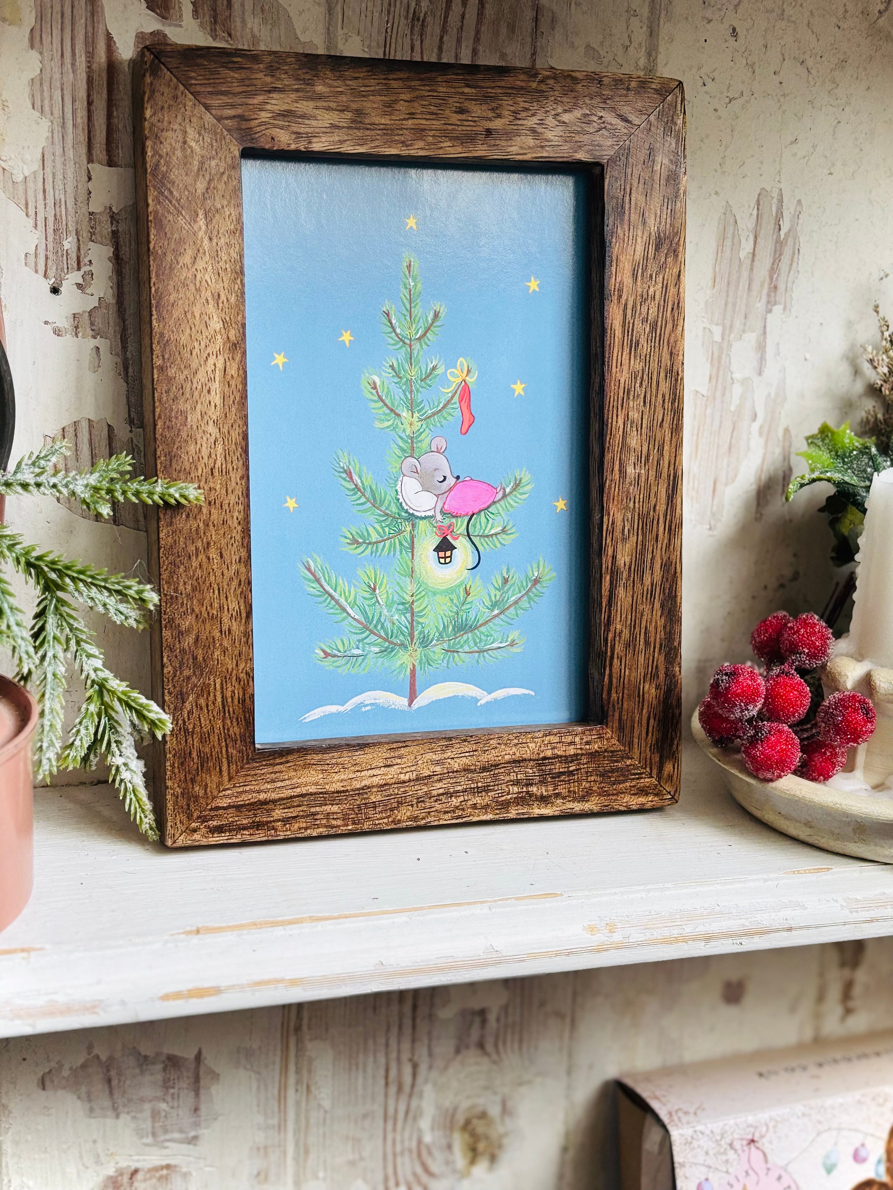 A cute postcard by Mary Adair for The Medici Society, framed in a lovely rustic style wooden frame. Full of joyful, warm and fuzzy  Christmas nostalgia!