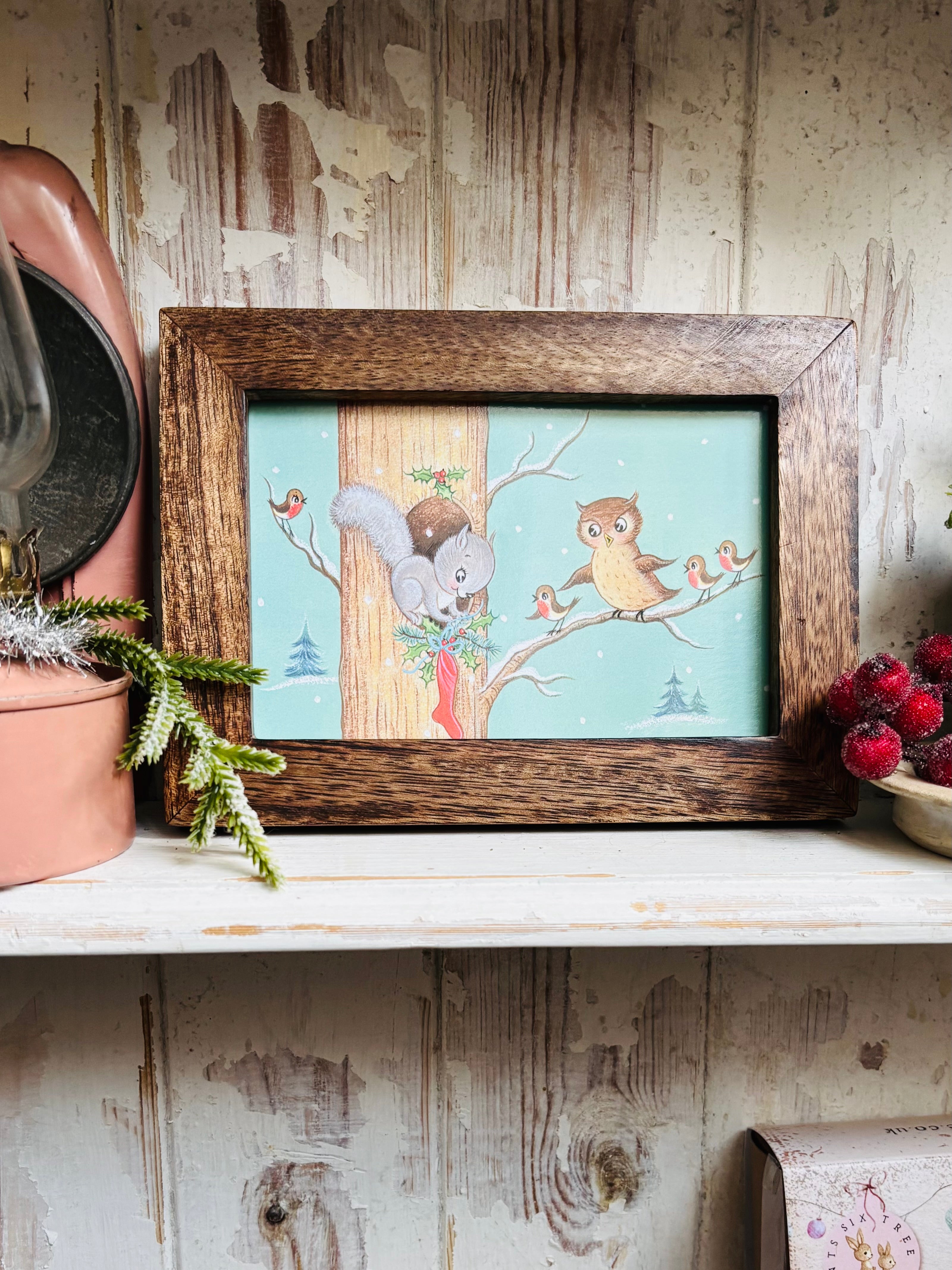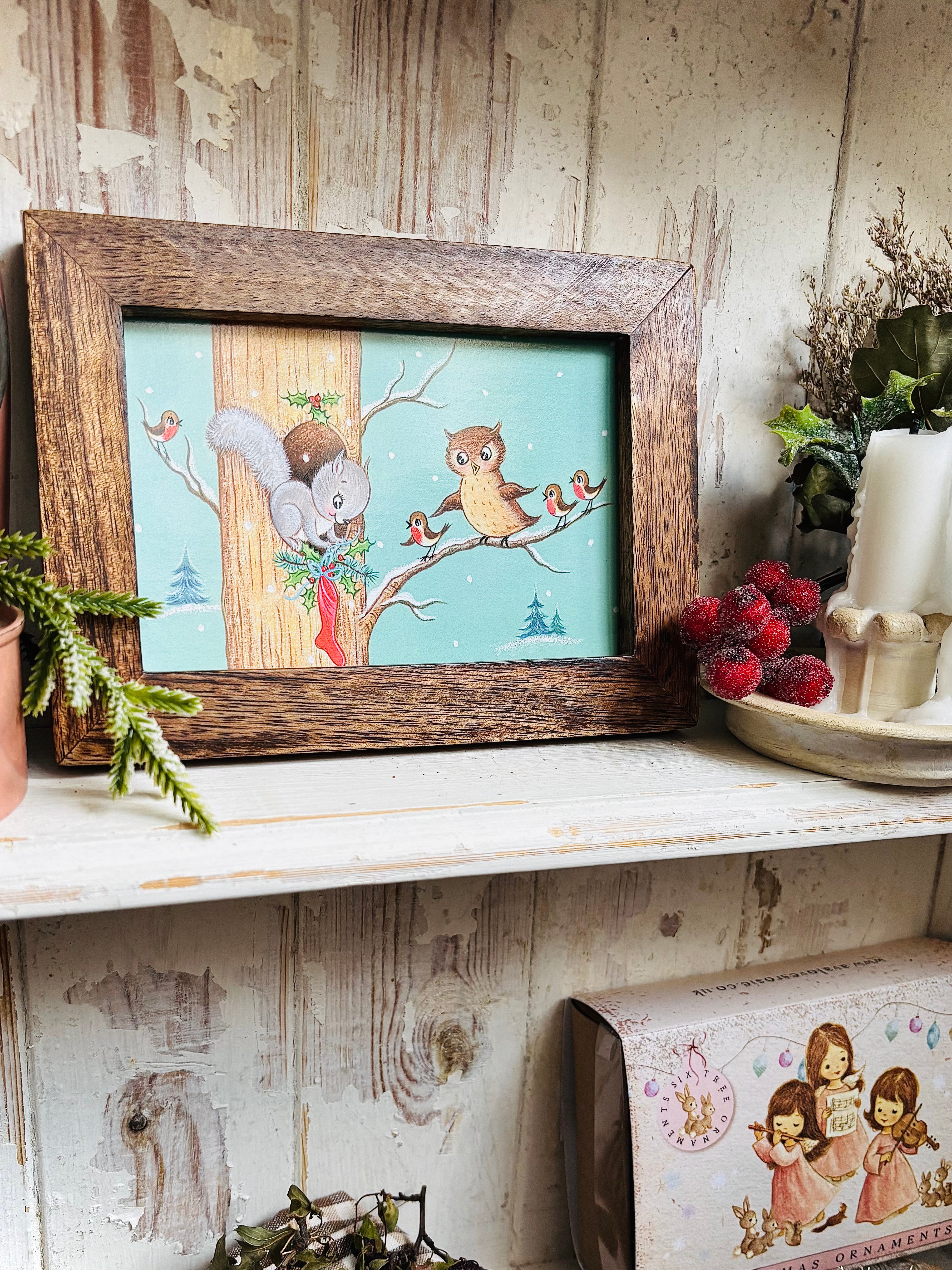 A cute postcard by Mary Adair for The Medici Society, framed in a lovely rustic style wooden frame. Full of joyful, warm and fuzzy  Christmas nostalgia!