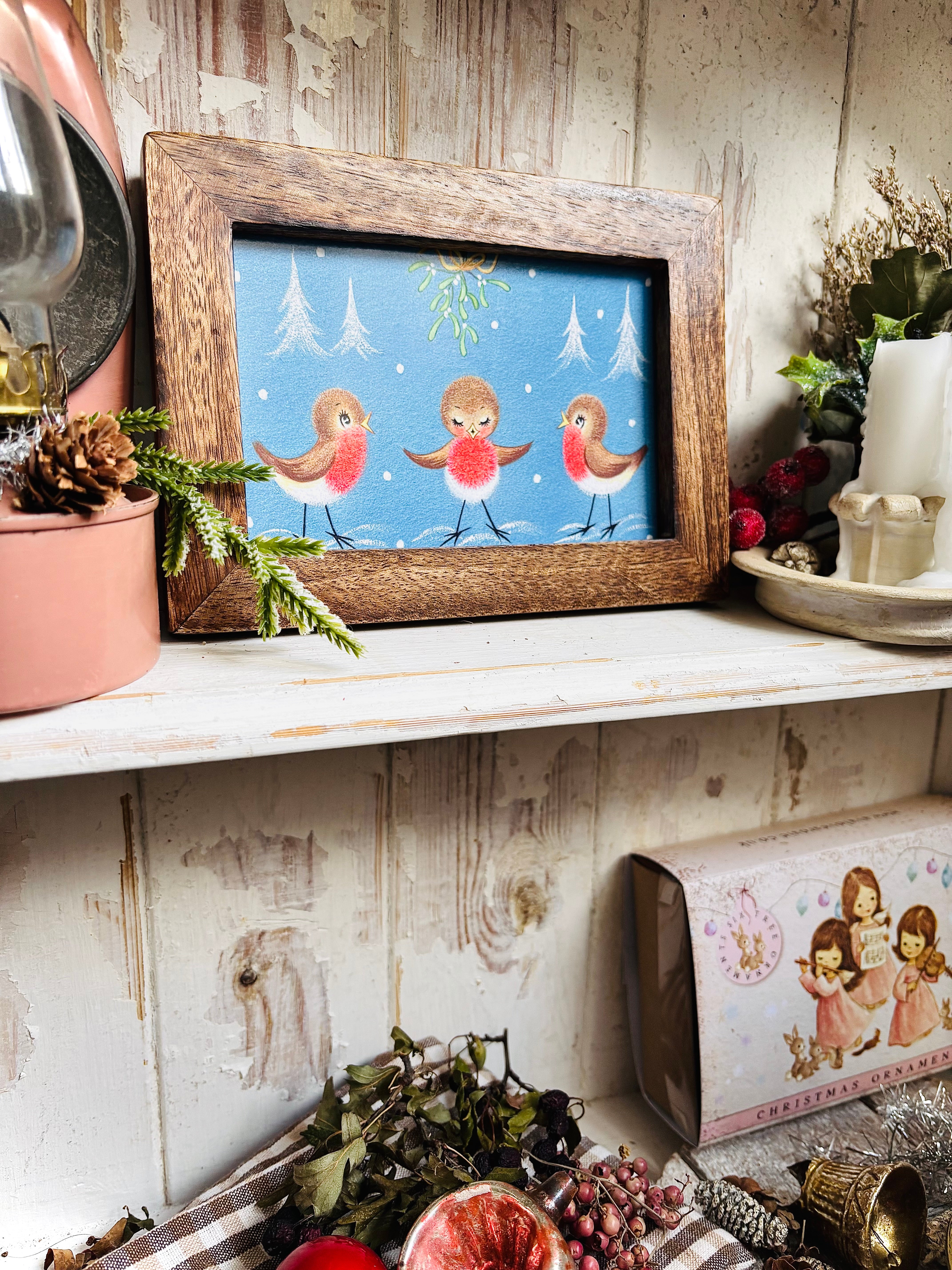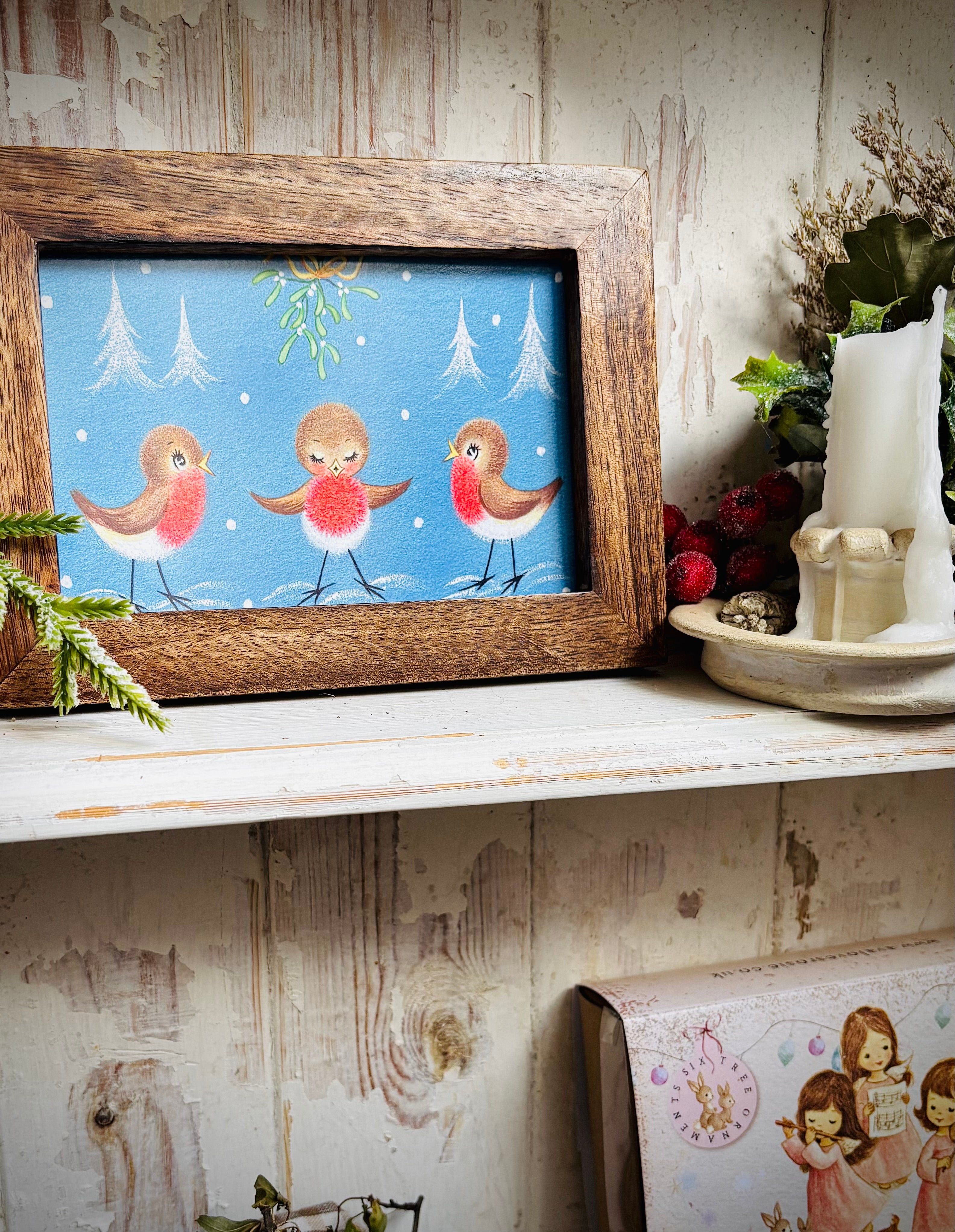 Framed Christmas Postcard - Three Robins Under Mistletoe - Mary Adair R698